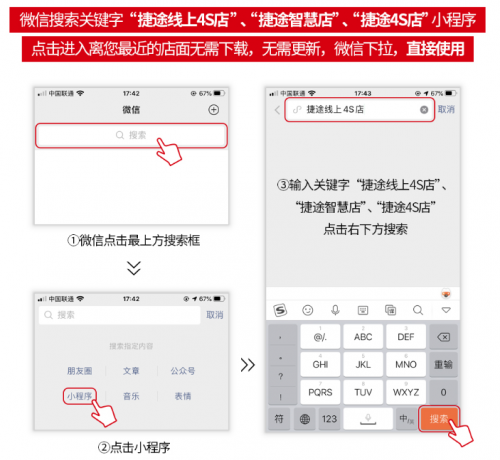 首先我们来迅速了解一下,如何进入这个捷途线上4S店。 捷途线上4S店基于微信小程序平台搭建,一步直达免安装,操作便捷简单,流程如下: 第一步 点击微信最上方的搜索框。 第二步 点击下方“小程序”选项。 第三步 在搜索框内输入关键字“捷途线上4S店”或“捷途智慧店”或“捷途4S店”小程序就能找到相关入口。