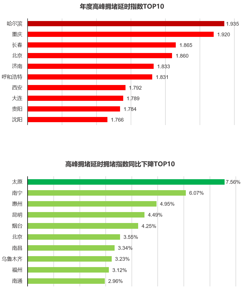 2月10日是企业复工的起点时间,随着企业复工的到来,公共交通得以逐步恢复,一些网友更是喜见堵车,奔走相告。再看2019年度的“十大堵城” 受疫情影响,拥堵延时指数并未向2019年初一样从初六开始持续上涨,而是一直持续保持畅通状态。复工后(2月10-2月21)“十大堵城”整体拥堵下降37.3%, 排名2019堵城排行榜前三的哈尔滨、重庆、长春拥堵降幅均超过40%,而昔日老牌堵城北京拥堵降幅达38.3% 。 在高德地图联合国家信息中心大数据发展部等单位共同发布《2019中国主要城市交通分析报告》中显示,哈尔滨取代老牌堵城北京,成为2019年度最拥堵的城市,重庆、长春分列二、三位,北京退居第四。