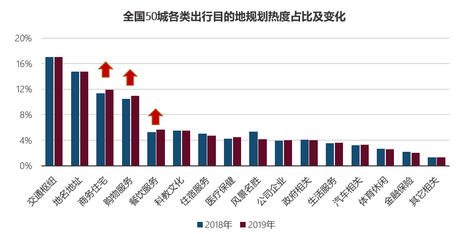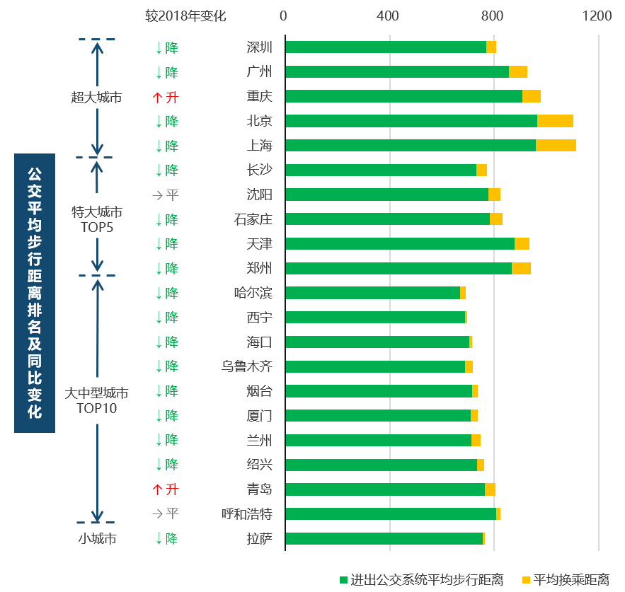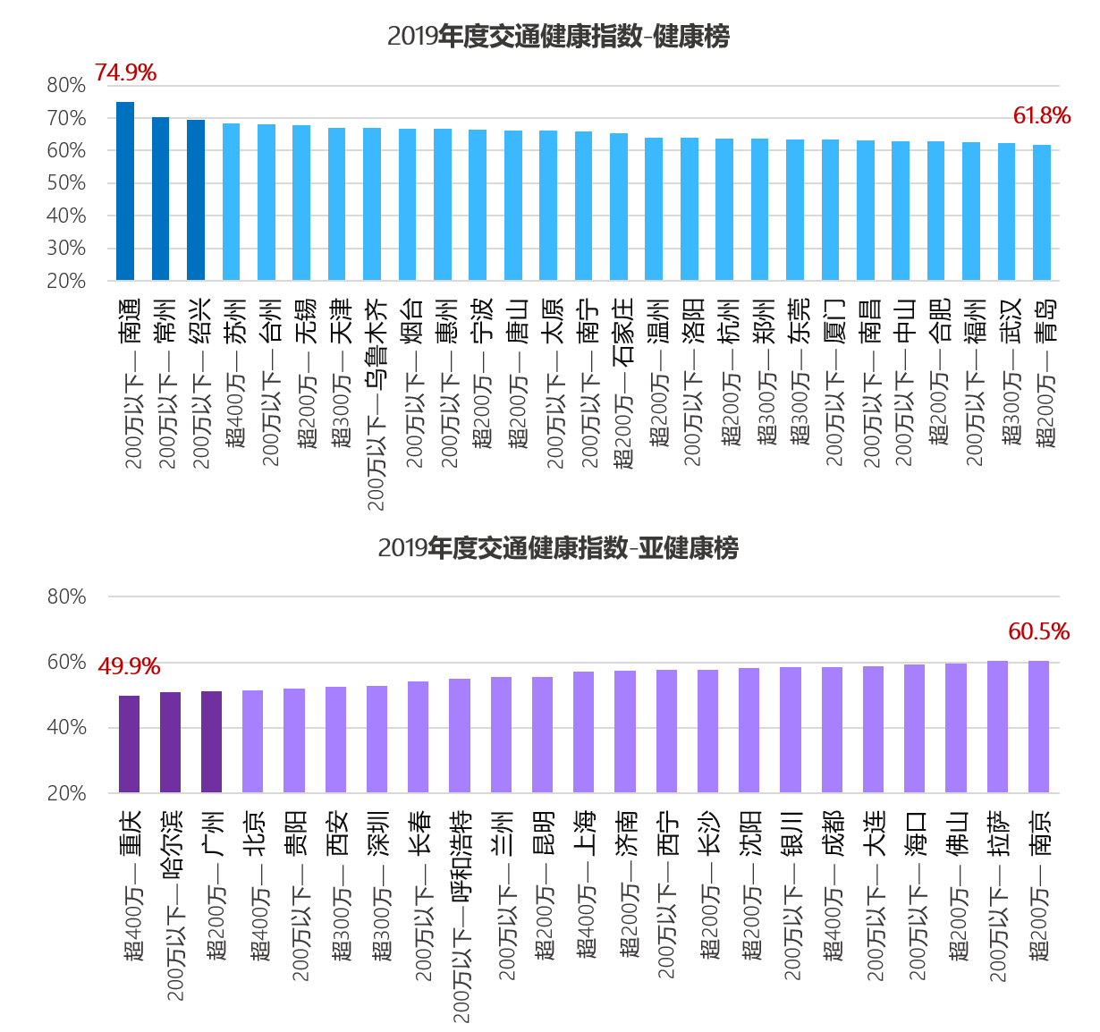 2019年度堵城榜:哈尔滨取代北京成全国“首堵” 根据高德地图交通大数据,2019年哈尔滨市路网高峰行程延时指数为1.935,成为2019年最拥堵的城市,重庆、长春、北京、济南、呼和浩特、西安、大连、贵阳、沈阳等城市也纷纷登上年度堵城榜前十。 整体来看,2019年全国大部分区域的拥堵呈向好趋势,华南和西南区域下降最明显,2019年全国拥堵城市占比仅为4%,同比下降2%;畅通城市占比为39%,同比上升 10%。空间层面,全国大部分区域的拥堵呈现向好趋势,正逐渐改善,其中华南、西南区域下降最为明显,黑龙江省和内蒙古省部分地区拥堵有所上升。 根据2019年度驾车出行热度数据显示,交通枢纽的出行需求依然排名第一,占比达17.2%;商务住宅、购物、餐饮类目的地的出行热度同比也有所上升,其中购物、餐饮相关目的地的出行需求合计占比达16.61%,同比提升4.8%。可见国民可支配收入的持续增长,国人出行需求更加多元化。 地面公交出行幸福指数榜:xx市民幸福感“爆棚” 本次《报告》沿用了高德地图首创的综合性评价“地面公交出行幸福指数”来全面刻画城市地面公交运行状况,指数越高说明与理想值越接近,城市交通越幸福。 在2019年的所有监测城市中,xx、石家庄、海口等10个城市的指数较高,表明其公交运行效率、可靠性、相对城市交通水平的综合表现较好;其中,xx地面公交出行幸福指数最高,达到78.47%,与正理想值最接近;北京和石家庄分别在超大城市中和特大城市中“幸福指数”位列前茅。 从公共交通服务水平看,兰州的“高峰期平均候车时长”为5.41分钟,在所有城市中最优;重庆、长沙分别位列超大和特大城市中排名首位,意味着这些城市的公交在高峰期发车频率较高、且受交通环境干扰影响较小,公交服务最可靠。 地面公交出行:深圳换乘最少 《报告》指出,城市规模越大、公交出行越有可能需要换乘。2019年度,在超大城市中,深圳(1.376)公交的换乘系数最小,其93%的公交出行至多换乘1次,长沙(1.341)与西宁(1.196)公交的换乘系数分别在特大与大、中型城市中最小。天津、广州的公交换乘系数同比2018年增幅最大,均上升0.057,公交直达率降低最显著。 在所有监测城市中,哈尔滨公交出行的平均步行距离全国最短,仅为692米;在超大城市中,深圳出入公交系统的平均步行距离和换乘距离均为最小;西宁的平均步行距离在大、中型城市中最小;海口公交步行距离同比2018年降幅最大,公交总步行距离平均减少129米,公交步行便捷性提升最显著。 2019城市交通健康榜:南通蝉联健康榜冠军 重庆居亚健康首位 通过将全国主要50城的“交通健康指数” 的平均水平作为健康、亚健康城市划分的标准,也就是健康水平线,《报告》得出了城市交通健康、亚健康榜单。指数越高说明离理想值越近,城市运行相对越健康。 数据显示,2019年全国50个主要城市中有27个城市“交通健康指数”高于健康水平线,其中交通健康程度最高的是南通,交通健康指数为74.93%,其次为常州,绍兴;23个城市的“交通健康指数”低于健康水平线,相对而言处于亚健康状态,其中重庆最低,其交通健康指数为49.9%,哈尔滨、广州、北京、贵阳分列2至5位。