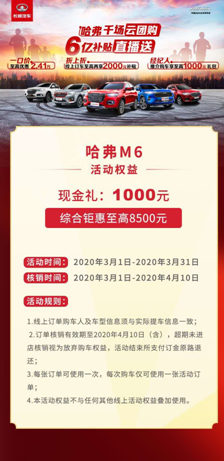 疫情的“暂停键”却开启了“宅经济”的按钮,宅家期间,继“云买菜”风靡一时后,为进一步满足公众安全出行的需求,各车企开启线上“云购车”“云服务”体验。近期,哈弗举办的“哈弗千场云团购,6亿补贴直播送”线上团购会活动,让明星车型哈弗M6再次以网红热车身份成为人们视线的焦点。 千场云团购,足不出户买哈弗M6 回看2019年的直播、带货领域出现一个个全新的爆点,销售场景也从线下转移到线上。而此次疫情期间,为了让用户足不出户轻松购车,哈弗也在线上举办了“哈弗千场云团购,6亿补贴直播送”活动。 2020年3月1日至3月31日,在抖音、快手等平台,哈弗全国4S店开展百人直播团近千场线上直播,让消费者尽兴看车、购车。而针对哈弗品牌旗下明星车型——哈弗M6,更制定了综合钜惠至高8500元 “好车折上折”、“好车一口价”优惠活动。 此图为“好车一口价”活动