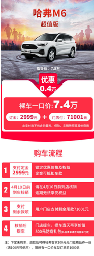 疫情期间,为保障大家无压力购车, 3月1日至3月31日,哈弗举办“哈弗千场云团购,6亿补贴直播送”线上团购会活动,大家不用出门,线上购车就可享惊喜优惠。活动期间,参加