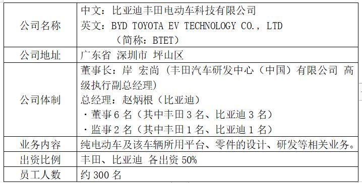 (2020年4月2日,北京)丰田汽车公司(以下简称“丰田”)与比亚迪 股份有限公司(以下简称“比亚迪”)合资的纯电动车研发公司——比亚迪丰田 电动车科技有限公司(以下简称“合资公司”)正式成立。丰田与比亚迪自 2019年11月7日就成立合资公司签订合资协议以来,双方积极推动合资公司 的筹备工作,合资公司计划于5月内正式开业。来自丰田的岸宏尚出任董事长, 来自比亚迪的赵炳根出任总经理。 对于合资公司正式成立,岸宏尚董事长表示:“合资公司成立以后,丰田和 比亚迪掌握各自技术强项的工程师会在一起相互学习,共同切磋造车技艺,从而开发出受中国消费者喜爱的性能优异的纯电动车。” 赵炳根总经理表示:“我们将是一家集合中日技术和经验的纯电动汽车技术研发的合资公司。 致力于推动、普及电动车更环保、安全、舒适、智能的高品质技术。我们的共同愿景是创造消费者为中心的未来出行、人与自然和谐共享的社会。” 【合资公司概况】 丰田与比亚迪将通过开发和普及受消费者喜爱的纯电动车,努力满足消费者多样化的需求,同时为中国的环境改善贡献力量。 丰田汽车公司 比亚迪股份有限公司 |