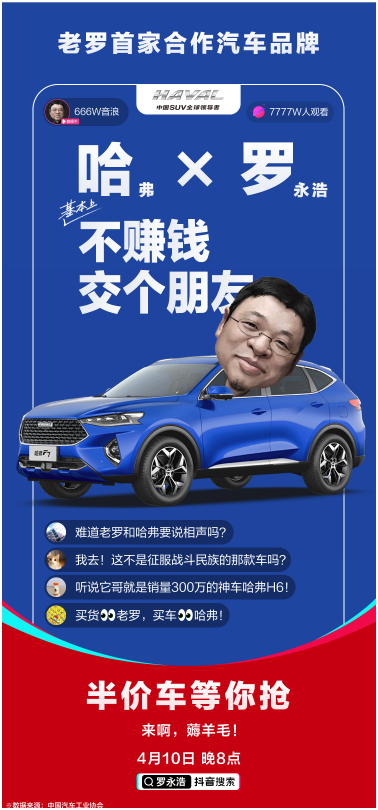 曾经混迹“科技圈”的老罗,近期跨界“直播圈”,热度刷爆网络!首次直播也在4800万人的围观中,斩获超1.1亿元的超强带货实绩,刷新抖音直播带货新纪录,人气直逼“带货一哥”李佳琦!乘着大好势头,明天晚上8点,罗永浩将迎来他的第二场直播。相比起“不赚钱,交个朋友”自带流量和噱头的首秀,这一场,老罗又将释放什么硬核“**锏”,让自己的网红带货之路走得更远? 据闻,老罗将在这场直播带货长城汽车旗下哈弗SUV其中一款热销“神车”。素有“神车”兄弟连之称的哈弗F7和哈弗H6,自然成为了网友猜测的“可疑对象”。明晚直播间,究竟会出现国民神车H6,还是全球车F7?谁会成为老罗交到的第一个“车圈朋友”?小编这就来为你揭晓! 这次直播,老罗交上的第一个“车圈朋友”——全球车哈弗F7。大家都知道,老罗虽作为直播圈新人,但前锤子科技CEO经历,让他在选品方面更加多了一份“匠人”的挑剔。因此明晚直播,老罗联手这款早已声名在外的“爆款”SUV——哈弗F7,可以说是情理之中。 老罗之所以交这个朋友,不难看出,他看中的是哈弗SUV的实力,冲着“强强联合”的目标而去。凭着哈弗SUV近年来的多项超凡荣誉:“连续十年国内SUV销量冠军”、“单一车型用户超过300万”、“自主品牌销售服务满意度第一”、“国民神车”、“全球神车”、“全球专项SUV品牌力超过JEEP、路虎,跃居第一”、“畅销全球60多个国家,销售近600万”等等,老罗会选择其旗下的“AI智能网联SUV”哈弗F7,也不难理解。更别说作为自主品牌首款真正意义上的全球车,哈弗F7还开进过克里姆林宫,接受中俄两国元首签字留念,出圈顶流名不虚传!有了哈弗F7的强力助攻,相信明晚老罗直播间看点不少! 除此之外,老罗选择带货这款“黑科技”满满的“AI智能网联SUV”哈弗F7,也是实力“宠粉”!要知道,罗永浩的“铁粉”和哈弗F7的目标客群高度重合,都是一群喜爱科技、沉迷智能未来感的“泛90后”。为了“圈粉”,两位顶流可谓不遗余力!哈弗F7配备同级领先的智能交互系统,在智能语音、智能娱乐、智能出行等方面表现出色。搭载AI智能语音识别系统,AI超级语境语音识别率高达97%,高于行业内95%的识别率;在智能安全方面,采用L2级自动驾驶,核心功能覆盖驾驶疲劳探测、AEB自动刹车系统、FCW前碰撞预警、LDW车道偏离预警等等。不仅如此,哈弗F7还采用了“太空科技美学”设计,整车的内外造型科技感十足,完美地满足了大部分90后年轻人的喜好和需求。 凭借着超强实力,人气爆款哈弗F7能够成为罗永浩汽车圈的第一个“朋友”,也让不少锤粉感到惊喜。有了这款神车加盟,相信明晚直播间将会掀起一波热潮,助力罗永浩坐稳“抖音带货一哥”的位置!汽车界流量担当与直播圈“顶流”最终会擦出怎样的火花?明晚8点,罗永浩抖音直播间不见不散!值得一提的是,“国民神车”哈弗H6也将在明晚18:30登陆哈弗智家&网易直播间!“神车”兄弟连强势出击,这周五直播圈要被哈弗承包了! |