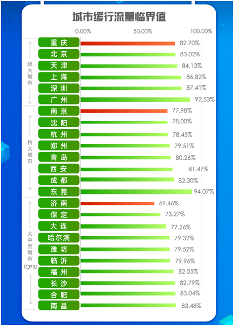 从全国拥堵恢复地图可以看出:华东、西北地区拥堵恢复状况较好,东北、华北相对较慢。在主要城市中西安、深圳、无锡、广州、石家庄等城市恢复最快,已超过去年同期的拥堵水平,杭州和上海拥堵恢复未及去年同期。同时,仍有不足1%的城市交通未恢复至去年同期的80%,其中以武汉、哈尔滨较为典型。 值得一提的是,受春节迁徙和疫情的双重影响,一季度的“十大堵城”中,济南、西安等作为区域经济中心省会级城市集中上榜,而北京、上海、广州、深圳、等一线城市均未入围,这也是作为老牌“堵城”的北京,本季同比拥堵降幅达19.4% ,首次未入榜前十。 此外,同比去年Q1有100%的城市拥堵延时指数下降。拥堵同比降幅最大的城市是武汉市,达29.0%。 在高德交通大数据监测的360个城市中,一季度有11.08%的城市通勤高峰处于缓行,88.92%的城市通勤为畅通状态。全国城市通勤高峰的拥堵热力图也首次告别“拥堵红”。 再从全国2020年一季度驾车活跃情况来看:一季度60%城市驾车活力不足正常状态下的8成。其中,北方驾车活力最低,多数城市不足正常情况下的70%,南方沿海城市以及湖北、重庆驾车活力相对较低,其它区域接近正常水平的90%以上。 在全国主要经济区域中,长三角、珠三角和京津冀等区域的高峰拥堵延时指数均低于全国平均值,其中长三角区域和珠三角区域高峰拥堵延时指数均为1.33,低于全国1.39,是交通状况最好的区域。成渝地区高峰拥堵延时指数是1.43,全国最高。 报告显示,受春运和疫情影响,全国主要城市绿色出行意愿在1月份逐步下降,而后稳定。其中,公交&地铁出行意愿指数在春节前快速下降,而同期骑行出行意愿指数快速上升。2月10日部分城市逐步进入复工复产后,公交&地铁出行意愿指数开始缓步回升,而骑行出行意愿基本平稳。 2020年一季度,北京绿色出行意愿指数排名第一。从各类绿色出行方式来看,公交&地铁、骑行、步行出行意愿排名第一的城市分别为北京市、海口市、兰州市。 一季度全国主要城市公汽电车客运量大幅下降,1-2月中心城市客运量仅为去年同期的49.9%,但城市公交高峰期的运行效率总体稳定。超大城市、特大城市的候车时长环比略有上升,大多数城市变化不大,早高峰平均候车时长均在20分钟以内。其中,沈阳候车时间最长,平均约19.8分钟。但也有部分城市的“车速比”环比有所下降。例如,厦门小汽车速度是公交的1.873倍,环比显著降低、公交效率明显上升。 2020年一季度,国内主要城市交通流量也经历了断崖式下跌、缓步回升的阶段。数据见证历史,这是近年来最特殊的一次“交通分析报告”,也是研究城市交通治理的契机。 高德交通大数据团队根据每个城市的交通特性曲线,测算了城市整体进入缓行状态的流量临界值。流量临界值越低,意味着畅通状态下城市能承载的相对车流量越少,城市路网的承受力越弱。超大城市中,重庆路网的承受力最弱,当早高峰流量达到82.70%时,城市将进入缓行状态。广州路网承受力最强,早高峰流量达92.53%时,城市才进入缓行状态。 而当流量超过一定程度后,城市将呈现出明显的节点拥堵特征,道路拥堵里程比会超过1%。据此,报告测算了每个城市出现节点拥堵的流量临界值。流量临界值越低,意味着较少的流量就会使城市关键节点拥堵,城市节点的承受力越弱。 高德交通大数据显示,超大城市中,重庆的节点承受力最弱,当早高峰流量达到57.49%时,城市1%的道路就会出现拥堵或严重拥堵。天津节点承受力最强,早高峰流量达77.46%时,城市才呈现明显节点拥堵。 当路网缓行流量临界值(路网承受力)和节点拥堵流量临界值(节点承受力)两个数据维度双高时,意味着该城市的早高峰呈现高韧性。数据显示,广州、石家庄、南宁、厦门等城市的早高峰均呈现高韧性,即拥堵抵御能力较强。 据悉,2020年一季度《中国主要城市交通分析报告》是由高德地图联合国家信息中心大数据发展部、清华大学-戴姆勒可持续交通联合研究中心、同济大学智能交通运输系统(ITS)研究中心、未来交通与城市计算联合实验室等单位共同发布。 |