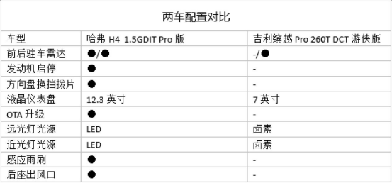 中国SUV全球领导者哈弗品牌旗下的紧凑型SUV哈弗H4 Pro便是这样一款让人欲罢不能的时尚精品之选。而改款上市不久的缤越Pro实力同样不容小觑,那么当这两位同样以Pro为后缀的年轻选手相遇,实力究竟孰优孰劣呢? 今天我们选取了哈弗H4 1.5GDIT Pro版(以下简称哈弗H4 Pro)和2020款吉利缤越Pro 260T DCT游侠版(以下简称缤越Pro游侠版)两款车型进行对比,之所以最终锁定这两款车型,主要是因为两车均为高配车型并且指导价也相差无几(指导价分别为:10.89万元&10.98万元)。 动力操控难分伯仲 哈弗H4 Pro品质更胜一筹 底盘及动力匹配的优劣直接影响到行驶品质,同时也是一款车驾乘体验的最直观体现。在这一点上两车都采用了时下主流的1.5T+7DCT动力组合,具体参数上两者也是不分伯仲。但在发动机结构上,哈弗H4 Pro选择了更为平顺的直列四缸结构,而缤越全系采用了三缸结构。 众所周知三缸发动机本身具有抖动和噪音大等问题,虽然在理论上可以通过偏心质量飞轮、平衡块、平衡轴等技术优化手段减轻这些问题,但也只算是在一定程度上抑制或延缓噪音及抖动向驾驶室传导,随着行驶里程的增加,抖动及噪音的问题将进一步凸显。
