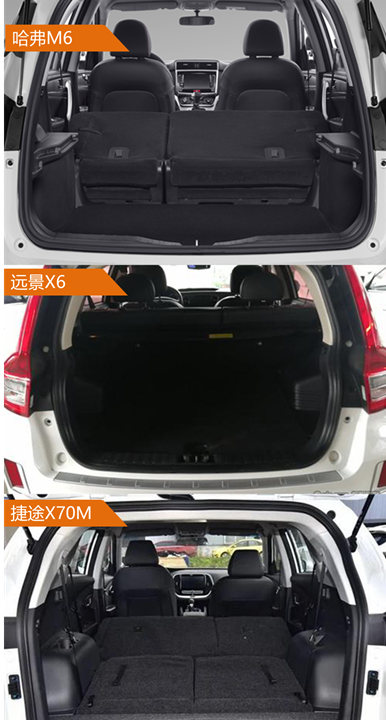 哈弗M6的车身尺寸为4649×1830×1705mm,轴距2680mm,内部驾乘空间可以媲美中型SUV,日常代步或者举家外出空间都可以游刃有余。远景X6在宽度和高度上略优于哈弗M6,但由于哈弗M6在长度和轴距优势更明显,所以后排的乘坐空间哈弗M6完胜。捷途X70M作为中型SUV,综合数据上要略优于紧凑型SUV哈弗M**远景X6。 在“能装度”方面,捷途X70M和远景X6进深和开口度都不错,能够很好的满足日常需求。哈弗M6的后备厢很灵活多变:常规下808L已足够放下一家大小的日常用品。后排座椅经6/4比例放倒后,还能延伸出最大2010L的超大空间,别说婴儿车、行李箱这些大件物品,就算是搬家、载货也都省心省事、“一趟搞定”。