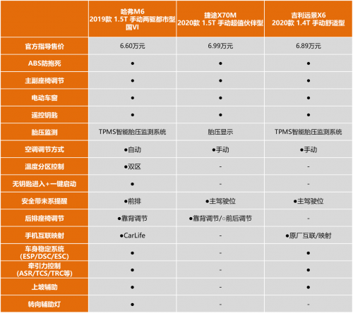 安全配置上,哈弗M6是三款车型中最丰富的。比起仅在主驾驶位配备安全带未系提醒的远景X**捷途X70M,哈弗M6前排皆有配备,在安全保障上要更让家庭用户放心。相比捷途X70,哈弗M6多出车身稳定系统、上坡辅助、转向辅助灯及牵引力控制系统等配置,更加好开且安全。此外,哈弗M6还搭载百度CarLife手机互联系统,导航、在线音乐播放更便捷。总的来说,配置更丰富、人性化的哈弗M6对驾乘者更加友好。