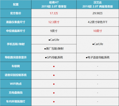 编辑点评:综合来看,无论是颜值还是空间,哈弗H7都比汉兰达略胜一筹,母亲节全家驾驶哈弗H7出游,老妈老婆Po图到朋友圈,不仅不输气场,还能彰显家庭门面。低调奢华的内饰更是质感满满,哈弗H7适合大胜这类追求品质生活的年轻家庭。 智能安全配置丰富,哈弗H7性价比更高 居家过日子讲究的是舒适,拥有一款配置丰富的车型,不仅能解闷,还能让出行更安心。智能配置方面,汉兰达支持第三方软件百度CarLife,可以实现电子语音导航,但音频播放需要通过蓝牙连接,没有搭载车联网同样是一大遗憾。 同级的哈弗H7则采用量产版Android 9.0系统,搭载科大讯飞的飞鱼系统,可实现语音识别、AI虚拟助理、生活出行服务等功能,只需动动嘴就能实现音乐播放、新闻搜索、导航控制、车辆控制,在实现便捷出行的同时增添诸多驾驶乐趣,在12.3英寸全液晶仪表盘与9英寸中控液晶屏的加持下,哈弗H7还展现出更浓厚的科技氛围。
