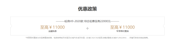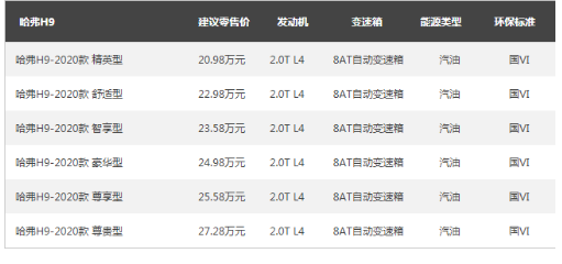 如果你喜欢户外,喜欢越野;如果你希望逃离城市的喧嚣,去大自然里感受自由。那么,你一定需要一辆越野车帮助你实现这份愿望。强大的越野性能,超大空间,驾乘舒适,同时兼顾家庭多人乘坐等,一定都是你选车考虑的要点。 以上条件全符合的越野车,是不是很贵呢?如果你了解了哈弗H9,一定不会有这样的疑虑。 哈弗H9自上市以来一直是国产硬派SUV的标杆车型,哈弗H9-2020款凭借百万级越野配置,低至20.98万的价格,超高的性价比,受到众多越野玩家以及注重实用性车友的好评。 哈弗H9搭载2.0T涡轮增压发动机配合8AT变速器,堪称黄金组合,动力输出线性,换挡逻辑清晰,操控性十分出色。最大功率165kW,扭矩达到了385牛米,低扭十分充沛。而且还有百万级车型才搭载的“三把锁”等越野黑科技,足以成为你仗剑天涯路上的利器。 哈弗H9空间宽大,5090mm*1926mm*1900mm的车身尺寸、2800mm的轴距,绝对可以笑傲群雄。无论是休闲腐败游,还是长途穿越,都有足够的空间拉人、载物。 虽然是一款越野车,但哈弗H9的内饰却没打一点折扣,精致的莫里斯棕内饰配色,细节的设计彰显了匠心工艺。9英寸的中控屏,视觉效果佳,全液晶仪表盘以及电子换挡杆质感十足,也极具科技感。 尊享大五座车型还配备了后排扶手触控屏,让后排乘客能随心意自由调节。高端品牌的哈曼国际Infinity音响、全景天窗(豪华版以上车型装配)等配备,更提升了驾驶感受及舒适性。 哈弗H9拥有汉密尔顿白、丛林绿、艾尔斯灰、炫晶黑四种颜色可选,丛林绿的最豪横,艾尔斯灰有质感,汉密尔顿白显精致,炫晶黑显霸气。相信总有一款,是你中意的。 为了回馈广大用户,哈弗H9推两大超值钜惠活动,最高可享受22000元补贴。 1、 金融贴息:最高可享受11000元金融贴息,36期免息,还款低至54元/日。另有更多金融政策可供选择。 2、 专享限时置换:老车主至高享受11000元置换补贴,其他品牌车型有高额补贴。 哈弗汽车作为中国SUV全球领导者,始终秉承引领中国汽车市场前行为己任,不但实力备受点赞,市场表现也一路领先。H9作为哈弗汽车的高端旗舰车型,凭借比肩百万豪车远超同级的越野能力,已经成为中国硬派越野SUV市场的王者。如果你想逃离城市,哈弗H9是你的不二之选。 现在入手哈弗H9,立享日供低至54元、36期超长免息优惠。真的不用再等了,仗剑天涯,有“9”就能出发。 |