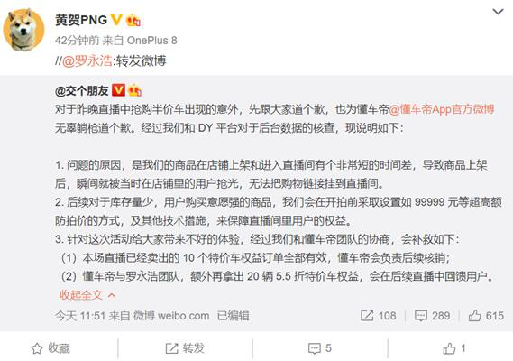 此前,罗永浩直播时曾在半价车抢购过程中出现意外情况,官方发布致歉说明表示,是由于商品在店铺上架和进入直播间有个非常短的时间差,导致商品上架后,瞬间就被当时在店铺里的用户抢光,无法把购物链接挂到直播间。