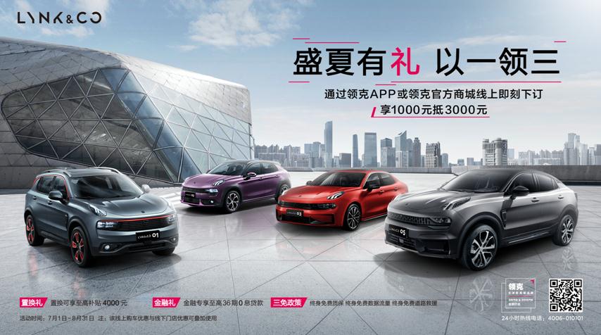 炎炎夏日,cool爽出行,别样生活,精彩不停。全球新高端品牌领克汽车于今日开启“盛夏有礼 以一领三”系列线上销售主题活动,在此前“领爱五月 以一领三”主题活动基础上,持续为消费者带来多重购车福利,更广泛深入惠及新老用户群体。与此同时,领克汽车还推出“01享天开,即刻趣野”、“02健身季,潮客挑战礼” 活动,以回馈广大消费者对领克的热情支持。 “盛夏有礼 以一领三”领克汽车多重福利持续放送 盛夏酷爽出行 购车福利享不停 作为用户品牌,领克汽车自首款车型投放至今,凭借出色的产品实力与服务品质,深受消费者青睐。领克汽车秉持用户思维,不仅为用户打造“不止于车”的用车生活,更持续为消费者带来高价值购车体验。 今年5月1日,领克汽车开启“领爱五月 以一领三”系列线上销售主题活动以来,受到消费者热烈欢迎。为继续回馈消费者的支持与信任,领克汽车再度开启“盛夏有礼 以一领三”系列线上销售主题活动,持续为广大用户提供高价值的购车福利。 即日起至8月31日,用户通过领克APP或领克商城在线下单购车,完成1000元订金支付,即可获得一张购车抵用券,用户凭该券在8月31日前提车时可直接抵扣线下3000元购车款(含1000元订金款)。该项福利涵盖了领克APP或领克商城在线销售平台的在售车型(03+及05时间限量版车型不参与本次活动),带给消费者实实在在的优惠。 不仅如此,购买领克车型的消费者还能享受多重用户福利: ·