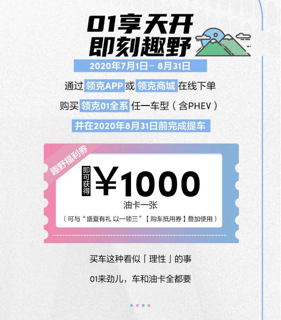 三免政策:终身免费质保、终身免费数据流量、终身免费道路救援。 趣享别样生活 多重惊喜再加码 用户是领克汽车不断发展的核心动力。为回馈新老用户的长期支持,领克还针对领克01消费群体推出“01享天开,即刻趣野”活动。2020年7月1日-8月31日期间,用户通过领克APP或领克商城在线下单,购买领克01全系(含PHEV)任一车型并在2020年8月31日前完成提车(以订单状态交易成功为准),即可获得1000元油卡一张。另外,领克01还限时开启“放肆贷”活动,月供低至666元。对于想要给周围朋友推荐购买领克01的车主,参与“伙伴计划”,新老车主均可获得5000Co币大礼。 与此同时,领克还将拥车权益融入消费者日常生活,推出“02健身季,潮客挑战礼”活动。凡是在2020年7月1日-8月31日期间,通过H5报名参加领克挑战营,并完成到店挑战的前5000名用户,经官方认证获得有效成绩后,可获得价值45元的QQ音乐绿钻季卡,畅享潮流出行体验。 作为全球新高端汽车品牌,领克的发展离不开用户的支持。未来,领克将继续秉持用户思维,坚持以创新的产品和贴心的服务,为用户不断创造全新品牌体验和高价值感,并持续践行“不止于车”的品牌主张,让用户尽享无忧购车、无忧用车的高端体验,带来更多惊喜。 |