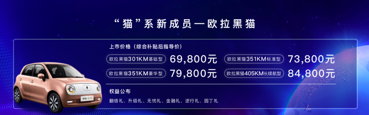 热炒多日的欧拉R1改名“风波”终于有结果了!7月24日,长城欧拉多款新车亮相成都车展,其中全新改款的欧拉R1正式上市,并更名为欧拉黑猫。新车共4款车型,厂商指导价为6.98万元-8.48万元,包括405km超长续航里程在内的21项内外升级,全面强化了硬核产品力,再次拉开了与同级追赶者的距离。正式更名后的欧拉黑猫,也将与搭档欧拉白猫继续丰富欧拉“猫系”家族矩阵,为年轻人带来非凡“智悦”生活新体验。 全新上市的欧拉黑猫还为消费者奉上了诚意满满的多重购车福利。包括1000元订金抵2000元现金优惠并且最大可叠加6次使用的钜惠“翻倍礼”;智能网联基础服务终身免费并赠送三年娱乐服务的贴心“升级礼”;电池终身质保(限首任个人车主)并赠送价值2000元家用充电桩、提供24小时免费道路救援的出行“无忧礼”;购车享3000元金融贴息的豪横“金融礼”;还有军人、警察、医护及其配偶购车享2000元现金优惠的专享“逆行礼”,以及教师及其配偶购车享2000元现金优惠的感恩“园丁礼”,六大超值上市权益为年轻人开启钜惠购车嘉年华。