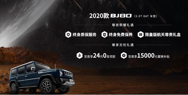荣耀征途,越舰星河!7月22日,定位于中国高端硬派越野新旗舰的北京越野2020款BJ80携手中国第一辆火星车正式上市,成为全球首款与火星车同台发布的车型,开创汽车行业先河,尽显旗舰气度。新车共发布“侠客”、“至尊”、“珠峰版”3种配置,提供3.0T+8AT与2.3T+6AT两款黄金动力总成,提供全黑、白黑、红黑、蓝白四个系列分色套装,售价区间29.8-39.8万元。同时为选购2020款BJ80(3.0T 8AT车型)的用户,带来了“尊崇荣耀礼遇”和“尊享无忧礼遇”双重大礼。“尊崇荣耀礼遇”包括终身质保服务、终身免费保养,限量版航天尊贵礼盒;“尊享无忧礼遇” 包括至高24月0息贷款、至高15000元置换补贴。 2020款BJ80与中国第一台火星车的联袂登场,是北京越野与中国航天再度携手的重要标志。发布会当天,中国首次火星探测任务工程副总指挥、探月与航天工程中心主任刘继忠也莅临现场,与北汽集团党委书记、董事长徐和谊共同按下启动键,迎来了中国第一辆火星车与2020款BJ80的携手亮相。 对于这样一次跨越天地的联手,徐和谊在主题演讲中给出了权威的解读:“这一合作的达成,源于越野人和航天人对探索精神的共同恪守,基于双方技术与品牌的深度融合,植根于对民族工业发展和中国力量向上的使命担当。”2020款BJ80以实力见证荣耀,勇担中国高端硬派越野新旗舰重任,它的出现,将推动中国越野车向高端化全面进化,为中国汽车品牌向上再添恢弘标杆。