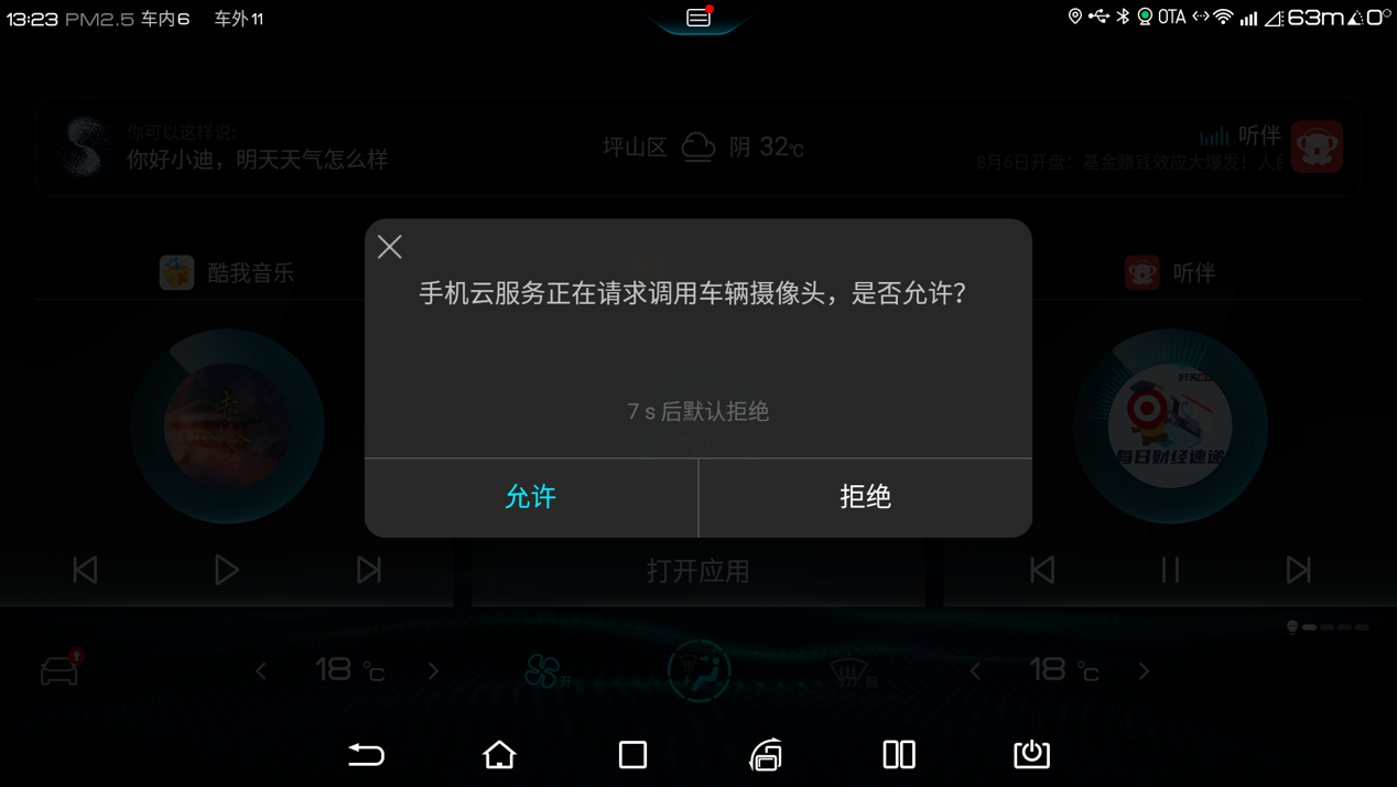比亚迪汉车内摄像头滑盖关闭状态 二重保障:软件设置,提示到位 在手机App和车内Pad上,用户也可以根据实际需要选择开启或关闭“千里眼”功能。同时如果监测到车内有人,千里眼被调用,车内Pad上更会给予温馨提示,用户选择是否同意摄像头被调用。而在系统数据安全层面,比亚迪DiLink研发团队更是进行了严苛的安全测试,通过安全芯片、安全网关、总线加密等构建了完善的安全体系。 比亚迪汉车内Pad可选择开关千里眼功能