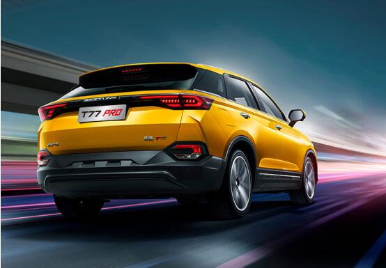 奔腾T77 PRO的前大灯具有远光灯、近光灯、昼间行驶灯及前位置灯功能,全部采用LED光源,远近光照明效果优于传统的卤素灯及氙气灯。同级竞品都在使用“低配卤素,顶配LED”前大灯战略的时候,奔腾T77 PRO低调地全系标配LED大灯,体现了一汽奔腾对用户的极大诚意。 据统计,驾驶员从发现危险到采取制动的正常反应时间为1.2秒,而车辆日常行驶速度最高为120km/h。驾驶员从发现危险到采取制动1.2秒内,车辆已经行驶了40米;采取制动以后,车辆减速到静止的时间是3.5秒,制动距离约为57米。从驾驶员发现危险到将车辆制动到静止,车辆行驶的距离97米。照射距离在100米以下的卤素大灯已经无法满足我们的安全需求了。 2020年,在家用车最高速接近200km/h的今天,仍然使用卤素灯照明的新车是对用户安全的极大藐视,而奔腾T77 PRO全部采用LED光源,不仅表现出对用户行车安全的最大诚意,凌厉的造型更于流光溢彩中展露棱角,整灯充满科技感,与前格栅设计完美融合,为奔腾T77 PRO雕塑感立体光影添上点睛一笔。 潮流前沿 贯穿式一字型绅士尾灯 成熟的设计一定是注重整体感的,奔腾T77 PRO的后尾灯采用贯穿式一字型绅士造型,轮廓与腰线连贯流畅,仿佛在山峦之间穿插出一条光之长河,尽显光影流动中的变幻之美。方形立体附加面罩结构晶莹剔透,渐变式与颗粒感制动灯设计增加了科技气息,尽展空间之美。奔腾T77 PRO后尾灯光导位置采用一体光源式设计,造型似箭尾一般简劲有型,为整车增添了锐利感和科技感。 双C后尾灯与双T前大灯遥相呼应,腰线将前后灯完美连接,一气呵成,肌肉线条环绕车身一周,犹如一把锋利的刀,将车窗与车身以黄金比例分割,令整车有一种蓄势待发的运动姿态,在车流中辨识度十足。
