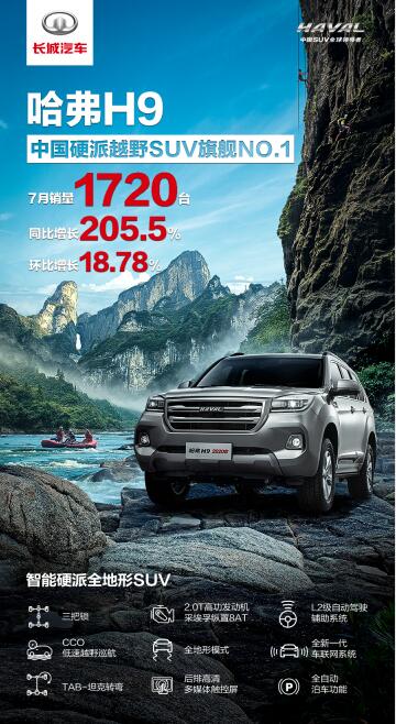 普拉多停产,中国硬派越野SUV市场王者易主 硬派SUV市场,始终以产品力见长。据乘联会统计,今年7月哈弗H9以月销1720台(同比增长205.5%,环比增长18.78%)的成绩,问鼎国产中大型硬派越野SUV销量冠军。2020年1-7月国内在产中大型硬派越野SUV累计销量排行中,哈弗H9以9006台稳居销冠宝座。对于中国越野来说,取得这样的成绩,意味着哈弗H9已经领跑中国硬派越野SUV市场,产品实力经受重重考验被用户认可。 扛起中国硬派越野大旗,哈弗H9为行业赋能 想在硬派越野SUV市场站稳脚跟,颜值和资历似乎都成了花架子,唯有实力过硬、配置够刚,才能通过崎岖坎坷,真刀真枪地攻克一个个战壕,占地称王。 哈弗H9依托哈弗品牌先进的技术支持和专业的SUV造车工艺,持续为硬派SUV市场赋能,成为中国名副其实的硬派SUV旗舰车型。