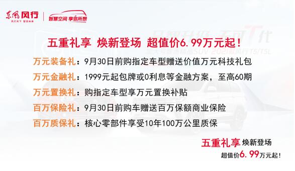 优惠升级,2021款T家族见面就送“五重礼” 加量不加价,东风风行始终坚守贴近用户的初心,在装备、金融、置换、潮流、保险、质保等方面,为喜爱2021款T家族的消费者提供了丰富的购车“五重礼”:凡在8月31日之前下单购指定车型的用户,均能享受购车五重礼。此外,为了让消费者安心畅行,用车无忧,2021款T家族全系可享最长8年或16万公里的超长质保。 作为风行3.0时代的战略车型,2021款T家族的全面升级,是东风风行品牌“智慧空间 享你所想”核心价值的完美诠释,也进一步提升了产品的整体竞争力。在品牌向上升级的浪潮下,东风风行将继续奋进,不负韶华,为消费者打造更加舒适、品质、科技感十足的车行生活。相信东风风行2021款T家族,必将在10万级SUV市场上取得非凡的成绩,让品质向上一步,美好更进一程。