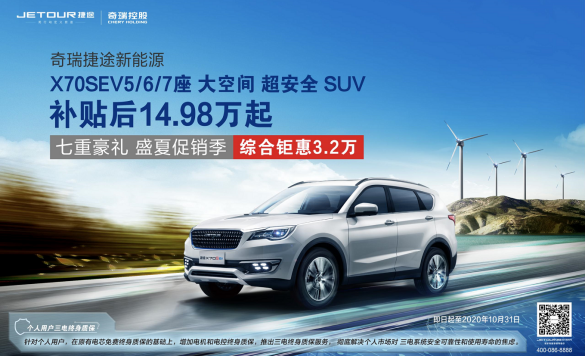 七重豪礼,盛夏促销季,综合钜惠3.2万元 此次奇瑞捷途新能源盛夏促销季活动将持续到10月底。即日起至2020年10月31日,凡订购捷途X70SEV,即可尊享7重豪礼: 1、500抵扣5000元车款 2、全系4000元置换补贴 3、多重贴息个贷,最高贴息8000元 4、免费赠送价值2000元2年娱乐流量 5、免费赠送价值1000元充电桩 6、免费赠送价值10000元三电终身质保 7、免费赠送价值2500元终身24小时免费道路救援 捷途X70SEV作为奇瑞捷途旗下首款智旅纯电SUV,定位于A+级纯电动力SUV,共推出3款车型,补贴后售价为14.98-16.98万元,采用永磁同步电机+磷酸铁锂电池的动力组合,NEDC续航里程达401km,在同级中达到领先水平。此次活动,针对个人用户,厂家在原有电芯免费终身质保的基础上,增加电机和电控终身质保,推出三电终身质保服务,旨在彻底解决用户对三电系统安全可靠性和使用寿命的焦虑。 自成立以来,奇瑞捷途始终坚持“以用户为中心”的理念,匠心造车,愉悦用户,满足用户不断升级的用车需求。即日起订购捷途X70S EV就送充电桩、2年娱乐流量,三电终身质保、终身24小时免费救援等重磅优惠,对新能源车型感兴趣的你还在犹豫什么呢?