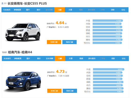 哈弗H4高品价比不仅反映在配置表单中,在实际的用户口碑评价中,哈弗H4同样有明显优势。比如在第三方汽车垂直网站爱卡汽车的用户综合口碑对比中,哈弗H4在操控、价格、油耗等多个维度都大幅领先,综合口碑得分在与长安CS55 PLUS的对比中无悬念胜出。