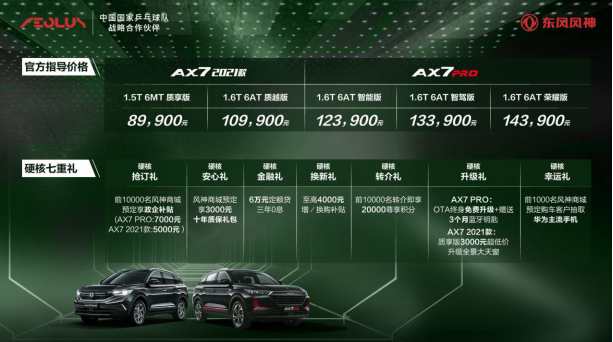 当硬核实力与智慧科技完美邂逅,将会擦出怎样的火花?栋梁本色,硬核升级,9月10日,著名军事评论家张召忠、中国乒乓球协会主席刘国梁、中国制造名片东风猛士强强集结,共同见证焕新而来的硬核智慧SUV——东风风神AX7 PRO的进阶之道。现场更有许昕、陈梦、孙颖莎等国乒名将助阵,各路高手各有风度,极限挑战跌宕起伏。作为东风风神面向主流SUV市场推出的重磅力作,东风风神AX7 PRO凭借硬朗造型、高效动力、智享科技、越级品质,上演一场精彩非凡的特别挑战行动,东风风神AX7 PRO正式上市,车系涵盖1.6T 6AT智能版、1.6T 6AT智驾版、1.6T 6AT荣耀版共计三款车型,官方指导价分别为12.39万元、13.39万元、14.39万元。此外,全民优选SUV ——AX7 2021款同步上市,官方指导价为1.5T 6MT质享版8.99万元、1.6T 6AT质越版10.99万元,让高品质出行的梦想轻松实现。 为了让更多用户畅享硬核品质,凡在指定时间预定东风风神AX7 PRO和AX7 2021款车型的消费者,还可享受抢订礼、安心礼、金融礼、焕新礼、转介礼、升级礼、幸运礼等硬核七重礼,点燃本色惊喜,尽享栋梁人生。