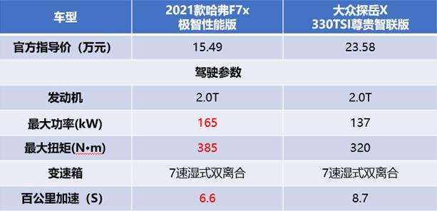 彻底放飞、玩转音乐,随着夏天的终结,2020年夏日限定的明日高校——《明日之子第四季》也终于落下了帷幕。细细想来,何为明日之子?不仅要有青春洋溢的外形,更要有热血中二、真实感性的内心以及能赢得“最强厂牌”的实力。明日,是未来,更是年轻人的天下。无论哪个领域,只要抓对年轻人的喜好,便能赢得未来。譬如在选车问题上,就有两款为年轻用户而生的轿跑SUV,上演了一场“谁是明日之子”比拼——2021款哈弗F7x和合资新宠大众探岳X。 值得一提的是, 2021款哈弗F7x是刚刚上市的新车,秉承“增配不增价”原则,以“五大上新”和“两大标配”的强劲实力,再次圈粉新生代年轻人。而大众探岳X作为大众家族的新秀,也在年轻化的道路上愈演愈烈,那么这两款车到底谁才是年轻用户心中的“明日之子”,我们不妨从动力、配置两方面进行一下对比。 热血澎湃的明日舞台,谁才是舞台的“能量王”? 舞台上的选手发光发亮能歌善舞,令明日之子肆意生长,观众在惊叹于新生代偶像实力不容小觑的同时,也被他们在舞台上的表现所感染,明日之子们对音乐的热爱,就像一个发光体,无时无刻不在散发着能量。而作为一款轿跑SUV,能用速度致敬市场,用激情回馈年轻用户,能量更是不可小觑。 动力上,两车均搭载了2.0T发动机,通过参数对比,2021款哈弗F7x的爆发力更强,起步更加迅猛,更加符合年轻用户勇往直前的性格。 加速上,2021款哈弗F7x百公里加速仅为6.6秒,展现了中国轿跑SUV的硬核实力。而大众探岳X则是8.7秒,差距明显,因此要在速度上寻找激情,年轻用户自然首选2021款哈弗F7x。尤其是在近日刚刚落下帷幕的“2021款哈弗F7/F7x极限王者挑战赛”中,