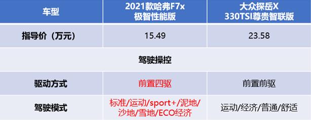 2021款哈弗F7x的“猛兽特质”更是得到了印证。在“极限加速挑战”项目上,2021款哈弗F7x在挑战者踩下油门后顷刻间便如离弦之箭般弹射而出,用百公里加速6.6秒为用户带来猛兽般的激情驾驭体验。 能有如此优秀的动力参数和加速力,得益于2021款哈弗F7x的“双十佳黄金动力”,发动机与变速器强强联合,强劲十足的引擎声加上风驰电掣的推背感,令其表现出“猛兽”般的极限性能。 操控性上,2021款哈弗F7x搭载的是智能适时四驱配备全地形控制系统,拥有标准/运动/sport+/泥地/沙地/雪地/ECO经济,满足年轻用户更多路况的使用场景。不仅如此,2021款哈弗F7x强大的操控性和稳定性,在挑战赛中也有着不俗表现。“极限精准射击挑战”项目中,在颠簸路面路段,嘉宾乘坐副驾驶座位透过车窗射击气球,命中最多者获胜。2021款哈弗F7x通过智能适时四驱系统和SUV大师级底盘调校双重“技压”,为用户带来了泰山般的驾乘稳定性。 相比2021款哈弗F7x在操控上的领先优势,大众探岳X略显“单薄”,其仅为前驱车型,在通过性和稳定性上不如四驱车型。不仅如此,大众探岳X仅有4种驾驶模式,在掌控路况方面也不如2021款哈弗F7x丰富全面。值得一提的是,大众探岳X四驱车型价格高达27.08万元,性价比上也不占优势。 盛世独秀争夺最强厂牌,谁才是舞台的“才艺王”? 有人说:“原创、唱跳、实力唱将…华语乐坛需要更多“明日之子”持续供氧。”《明日之子》让听众认识了解音乐的多元性,这里没有条框去限定你的表演风格、音乐个性,这不仅仅是《明日之子》的节目立意,也是无数年轻人的内心呐喊。作为一款车,其存在的意义也早已不是最初的模样,同样需要去“进化”,去创新,用更年轻多元的姿态,与时代共同进步。纵观两款车,都在用不同的方式“吸收精华”,用更丰富的“才艺”为年轻用户提供更合胃口的座驾。 智能驾驶上,2021款哈弗F7x搭载ADAS全新高级智能驾驶辅助系统,支持L2级自动驾驶功能,同时支持全自动融合泊车功能,全面颠覆了传统车的模样,只能说,它充满智慧的样子真帅气。不仅如此,2021款哈弗F7x还搭载了自动泊车、全自动倒车循迹、车底透明功能等高端车存在的辅助功能,智能表现越级。 如碰见停车位空间极窄的情况,便可通过全自动融合泊车系统,用户只需要“动动口”,系统便可自行转动方向盘,走出最佳轨迹。同时,当想要返回重新倒车时,全自动倒车循迹功能可自动记录最近一次前进的50米路线,并在倒车辅助功能启动后,精准灵活地按原路线退回。不仅如此,为了让停车更加安全便捷,车底透明功能“申请加入”,其可以通过车辆行驶轨迹周边区域的视频信息与地面信息叠加,动态显示车辆下方的路面图像,全面提升倒车的成功率和安全性。