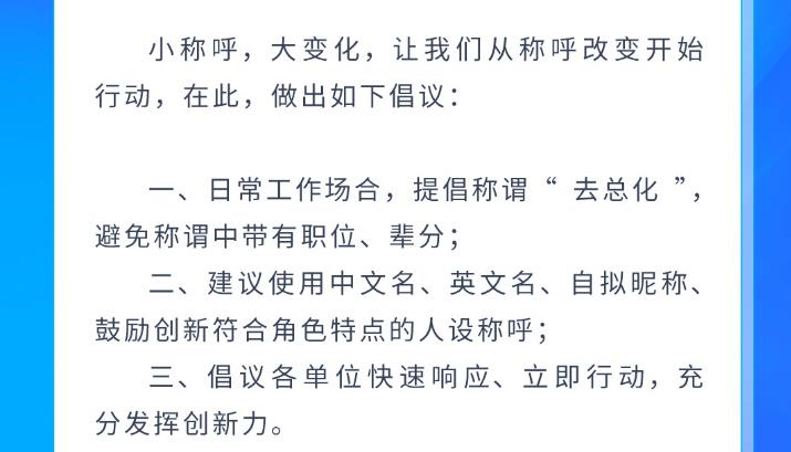 说起“去总化”,这在中国的互联网行业不算什么新鲜事了,像阿里巴巴创始人马云的花名“风清扬”、腾讯创始人马化腾的英文名“Pony”等等都可以说是家喻户晓。 不过,这并不意味着“去总化”已经成为大众化产物了,在注重礼仪的国人看来,人际交往中重视职位与辈分是中华民族传承千百年的习俗,特别是在一些传统的行业和产业尤为看重,作为中国经济支柱产业的汽车制造业也不例外。 长城汽车内部称谓“去总化”倡议 然而近日,在短短半个月内,长城汽车率先打响了传统车企“去总化”第一枪,另一家主流中国汽车企业吉利也迅速跟进,宣布告别“总”时代,这背后的故事或许值得深思。