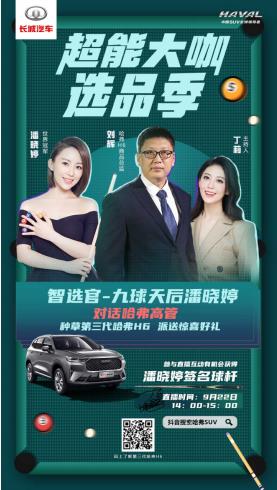 今年,许多品牌纷纷加入直播带货的战场,直播带货俨然成为了行业热词。然而决定直播成功一大要素,则在于选品环节,如何选出消费者最为关注且具备爆款特质的产品至关重要。9月22日,哈弗H6超能大咖选品季火热开启,“智选官”潘晓婷将为第三代哈弗H6打call并带货,为消费者带来不一样的神车解读。而中国SUV销量冠军与体坛冠军在直播间相遇,又会碰撞出怎样的火花? 今年,许多品牌纷纷加入直播带货的战场,直播带货俨然成为了行业热词。然而决定直播成功一大要素,则在于选品环节,如何选出消费者最为关注且具备爆款特质的产品至关重要。9月22日,哈弗H6超能大咖选品季火热开启,“智选官”潘晓婷将为第三代哈弗H6打call并带货,为消费者带来不一样的神车解读。而中国SUV销量冠军与体坛冠军在直播间相遇,又会碰撞出怎样的火花? 体坛冠军力荐爆款神车 哈弗H6再现硬核实力 本次哈弗H6超能大咖选品季,智选官、明星选品官以及特色选品官将陆续现身哈弗SUV直播间,为消费者推荐爆款神车,深度展现国民神车的硬核实力。而在9月22日,台球冠军潘晓婷将作为智选官,现身哈弗SUV抖音直播间,并与哈弗商品总监刘辉展开深入对话,为网友们揭晓国民神车成为爆款的秘籍所在。 潘晓婷是中国台球界第一位获得世界锦标赛冠军的选手,曾获得个人职业生涯的10个世界比赛冠军头衔,被誉为中国的"九球天后" 。台球冠军空降直播间,将带来怎样的神车解读?冠军成绩的背后有哪些不为人知的故事?体坛冠军与车界冠军强强联合,又将达成怎样的默契与共鸣?在大咖选品季,会有怎样的购车惊喜?更多精彩,尽在哈弗H6超能大咖选品季。 体坛冠军与车界冠军强强联合,将会全方位展现第三代哈弗H6的冠军基因,赢得更多消费者的信赖。通过“智选官”的深入解读,将使神车实力更加深入人心,并以惊喜福利回馈广大消费者,使第三代哈弗H6成为更多消费者的选择,掀起全民pick热潮,树立云购车时代的新标杆!
