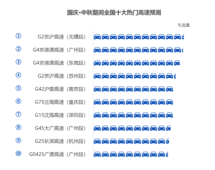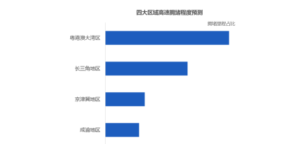 预计十一期间粤港澳大湾区高速拥堵程度最高 四大区域方面,预计粤港澳大湾区高速拥堵程度最高,长三角次之,其次是京津冀地区与成渝地区。 四大区域出程高速拥堵高峰在10月1日9时-11时,粤港澳大湾区、长三角地区在9月30日22时-10月1日凌晨2时会出现拥堵小高峰;返程高速拥堵较为分散,拥堵程度低于出程。 出程方面,预计10月1日假期首日,京津冀地区高速易拥堵缓行路段主要有京台高速、京藏高速、荣乌高速、京港澳高速等;长三角地区高速易拥堵缓行路段主要分布在苏州、南京、无锡、上海等城市周边;成渝地区易拥堵缓行高速主要集中在成都、重庆周边出城方向;而粤港澳大湾区的沈海高速、广昆高速、长深高速等部分路段也易出现拥堵缓行。 返程易拥堵路段方面,长三角地区预计宁洛高速(滁州段)石门山大桥-三界收费站拥堵缓行程度较高;粤港澳大湾区沈海高速(深圳段)松子坑大桥-水荷立交拥堵缓行程度较高;成渝地区包茂高速(重庆段)金佛山互通以西-龙凤山隧道易发生拥堵或缓行;预计京津冀地区高速较为平稳,拥堵程度低于出程。