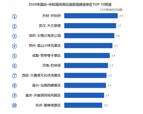 十一假期十大拥堵景区预测出炉:开封市开封府居首,武汉木兰草原第二 受假期出游需求集中的影响,十一期间,部分景点周边道路将会出现易拥堵缓行状态,根据高德地图交通大数据预测 ,周边道路易拥堵景区排名前三依次为:开封市-开封府、武汉市-木兰草原、深圳市-大梅沙海滨公园。