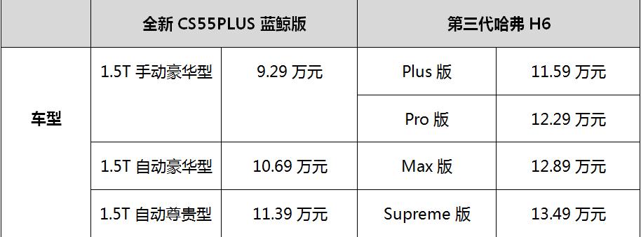 为何“瓦罐”旅行车在欧洲经久不衰?为何“油耗子”皮卡在北美始终受宠?为何国人对SUV无论大小都青睐有加?背后除了地域、交通,以及消费能力的差异,群体的示范效应也不可忽略。尤其对于喜欢随大流的国人来说,似乎这样才是最简单,最省心,也是最安全、最保险的选择。殊不知,随着新技术层出不穷,新车型不断出现,随大流的购车方式已经落伍,众口不是总能铄金,神车也非不可超越。不信?就拿刚刚上市不久的两款紧凑级SUV——长城汽车第三代哈弗H6、长安汽车全新CS55PLUS蓝鲸版来次比较,看一看随大流是否依然是最正确的选择。 价格不是唯一,唯一的是手里有多少预算 相比选择全尺寸SUV的消费者,选择紧凑级SUV的人群往往对于价格比较敏感。所以如何定价就成为吸引消费者的关键一环。第三代哈弗H6共有4款车型,包括Plus版、Pro版、Max版、Supreme版,厂商建议零售价格分别为11.59万元、12.29万元、12.89万元、13.49万元。而全新CS55PLUS蓝鲸版共推出三款车型,包括1.5T手动豪华型,售价9.29万元;1.5T自动豪华型,售价10.69万元;1.5T自动尊贵型。售价11.39万元。 从价格上来看,第三代哈弗H6整体高于全新CS55PLUS蓝鲸版,这对于消费者而言也就意味着更高的起点。如果手中购车预算12万元以内,那么只有第三代哈弗H6的入门车型1.5T自动Plus车型可以考虑。但是如果选择全新CS55PLUS蓝鲸版,则可以买到顶配的1.5T自动尊贵型。因此从价格上来看,全新CS55PLUS蓝鲸版似乎已经略胜一凑。不过众所周知,想要打动消费者光有便宜的价格还远远不够,汽车的动力性能如何?配置内容如何?安全表现如何?同样也非常重要。具体到两款车型来看,究竟谁更值得购买?还要继续比下去,真相才能水落石出。 动力不是一切,但是没动力一切都不好办 随着国内外排放法规的日益严苛,小排量+涡轮增压已经蔚然成风,所以第三代哈弗H6与全新CS55PLUS蓝鲸版都选择了搭载1.5T涡轮增压发动机,并且都配备7速湿式双离合变速箱。不过除此以外,两者的动力表现却截然不同。 第三代哈弗H6搭载的代号GW4B15A的1.5GDIT EVO发动机,最大功率124kW,峰值扭矩285N·m。而全新CS55PLUS蓝鲸版搭载的蓝鲸NE 1.5T高压直喷发动机,最大额定功率132kW,在1250转即可输出300N·m峰值扭矩。相比前者,无论功率,还是扭矩都明显更胜一筹。 全新CS55PLUS蓝鲸版搭载的蓝鲸NE 1.5T高压直喷发动机 第三代哈弗H6搭载的1.5GDIT EVO发动机 此外,在消费者关注的油耗方面。目前,第三代哈弗H6工信部综合油耗数据尚未公布,但是厂家宣称百公里油耗为6.6L。而全新CS55PLUS蓝鲸版的工信部综合油耗仅为百公里6.4L。两者油耗差距看似不过1L左右,但是积少成多也是一笔不小的开支。所以蓝鲸NE 1.5T高压直喷发动机采用的同级唯一“双出口集成排气歧管+双涡管电控轮增压”技术,以及独创的“AGILE敏捷”空气导流式高效超净燃烧系统,显然具有非常现实的意义,既能帮助车主降低用车开销,同时也起到节能减排的作用。 配置不能责全,但是配置真的不能太简单 除了追求发动机的强劲性能,消费者对于配置的热情同样高涨。所以第三代哈弗H6与全新CS55PLUS蓝鲸版都对配置非常重视。以售价11.59万元的哈弗H6 1.5T自动Plus车型与售价11.39万元的1.5T自动尊贵型进行比较。不难发现两款车都采用了前麦弗逊后多连杆独立悬架,都采用电动助力。都具备前双安全气囊、前排侧气囊、前后排头部气帘,以及胎压显示,都具备丰富的主动安全系统(全新CS55PLUS蓝鲸版搭载大陆ESC全新车身电子稳定控制系统。包含TCS/BA/HHC/HDC/DBF/ROM等功能)。都标配定速巡航、后倒车雷达、无钥匙启动系统,多功能方向盘、液晶仪表、GPS导航、车联网、OTA升级。此外,LED自动头灯、雨量感应式雨刮、自动空调等内容也是两款车的标配。 全新CS55PLUS蓝鲸版中控台 第三代哈弗H6中控台 当然除了众多共性之外,两款车在配置上也存在不少差异。例如,在倒车影像方面,第三代哈弗H6的1.5T自动Plus车型提供的还是普通2D画面,而全新CS55PLUS蓝鲸版1.5T自动尊贵型却配备了360度全景影像。哈弗H6的1.5T自动Plus车型具备后者没有的发动机启停、自动驻车,方向盘换挡、疲劳驾驶提示等功能。 全新CS55PLUS蓝鲸版具备可开启全景天窗 而全新CS55PLUS蓝鲸版1.5T自动尊贵型则拥有前者没有的可开启全景天窗、车顶行李架、内置行车记录仪、主驾驶座位电动调节、前排座椅加热功能,后排座椅中央扶手、可电动折叠的后视镜、加热、锁车自动折叠的后视镜,以及车载空气净化器、负离子发生器等配置,且全系搭载PM0.1级复合抗菌抗病毒滤芯,采用多层高效过滤网,可高效过滤≥0.1µm颗粒物,对≥0.3µm颗粒物过滤效率达95%以上,能有效阻隔病毒附着颗粒及其他粉尘颗粒。 全新CS55PLUS蓝鲸版语音控制系统具备多轮语音对话功能 并且,全新CS55PLUS蓝鲸版还具备强大的智能语音交互能力,一句“你好小安”,即可实现多媒体系统、导航、电话、空调、天窗等众多功能的操作。而且语音交互系统还实现了多轮对话能力,在一次唤醒"小安"之后,无需多次唤醒即可执行接下来的其他指令,相比普通语音系统更便捷,更顺心。 全新CS55PLUS蓝鲸版座椅采用高档NAPPA皮纹材质 值得一提的还有全新CS55PLUS蓝鲸版的内饰,不仅座椅采用性能优异的NAPPA皮纹材质,包裹感十足,柔软度、密实度和弹性兼顾;而且整车内饰皮革占55%以上,除座椅外,主要分布在4个门内饰板、