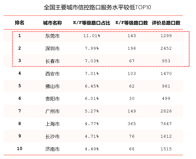 数据显示,三季度早晚高峰时段服务水平较低路口占比较大的城市主要分布在珠江三角洲,排名前三位城市分别为东莞、深圳和长春,占比分别为11.01%、7.99%、7.03%,其中东莞E和F等级的路口143个,深圳196个,长春67个。 |