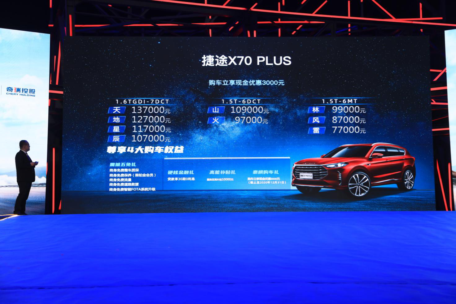动力方面,新车搭载1.6TGDI+7DCT黄金动力组合。该发动机采用应用于BBA的博格华纳快速响应增压技术,拥有行业领先的37.1%发动机热效率,最大功率145kW,最大扭矩290N·m。另外,新车搭载了博世最先进的L2.5级自动驾驶系统,拥有ACC自适应巡航+AEB自动紧急制动+APA全自动泊车等多项功能,能有效提升驾驶体验。 进入车内,新车全力打造数字化智能生态座舱,10.25英寸全液晶智能双联屏,科技感十足,使用科大讯飞飞鱼语音技术,搭载了华为HiCar手机互联系统,能实现手机、中控屏与智能双连屏三屏互动全场景体验。此外,新车还有商汤科技DMS+OMS人脸识别功能,可对驾驶员疲劳监测做出提醒,并对车内10立方厘米以上活动生命体进行生命体征监测。 在安全方面,捷途X70 PLUS采用75%高强度钢笼式车身、6安全气囊,做到战甲级车身防护。在高性能制动系统应用下,新车的百公里制动技术达到领先水平,百公里制动距离仅为36.5m。种种搭配和配置说是强者当之无愧。 为自强青年而生的捷途X70 PLUS分为九个车型,分别是天、地、星、辰、山、火、林、风和雷。售价为77000元—137000元,购车可享“震撼五免礼”、“硬核金融礼”、“高能补贴礼”、“豪横购车礼”四大购车权益。