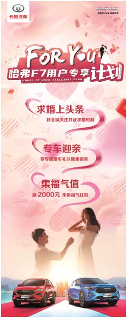 由于2021款哈弗F7/F7x的用户大部分都是年轻人,其中不乏准备结婚的用户,对此2021款哈弗F7/F7x分分钟帮你安排!针对新婚夫妇用户,2021款哈弗F7/F7x推出 “求婚上头条”、“婚礼专享迎亲车队”以及“新婚福气红包”三大福利。