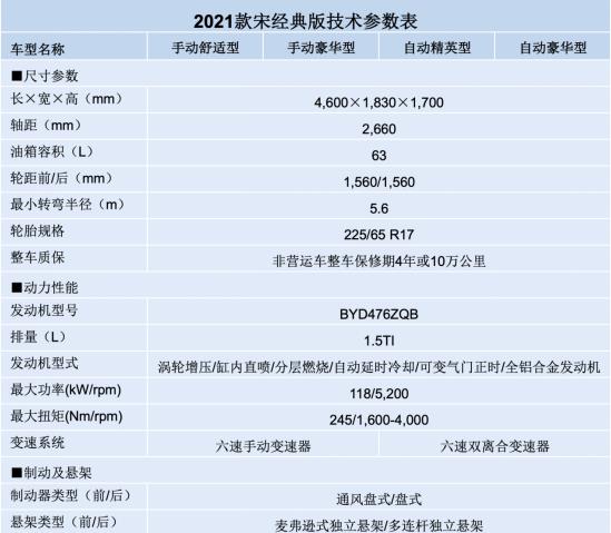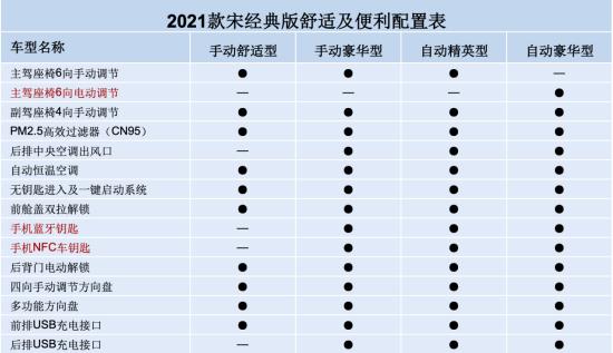 提供四款车型,配置丰富,可选范围更进一步 现款宋经典版为用户提供三款车型, 2021款将新增一款自动豪华型,配置更丰富,如带有电动折叠功能的外后视镜、带有防夹功能的四门车窗、支持6向电动调节的驾驶席座椅等,给用户提供了更全面、多样的选择。