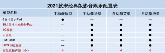 看、听、用全升级,智能体验更进一步 采用悬浮式设计的中控屏幕是现款宋经典版的一大特色,相比同级产品,这样的设计更具科技感。根据配置等级不同,2021款宋经典版中控屏尺寸也有差异。手动舒适型配备8英寸固定Pad,其他车款配备10.1英寸电动旋转Pad,使用更舒心。 通过蓝牙,2021款宋经典版车型可以轻松实现手机、车机的互联,而新增加的4G移动通信模块,则进一步提升智能交互体验。 2021款宋经典版还支持云服务功能,可实现车况监测、位置查看、解锁车门或远程开启空调等功能。新增的GPS智能导航系统还能为用户提前规划路径,实现精准导航的同时,让出行更便捷。 另外值得一提的是,2021款宋经典版音响系统的扬声器数量由之前的2个增加到4个,自动豪华型更将配备6扬声器音响,音响效果显著提升。