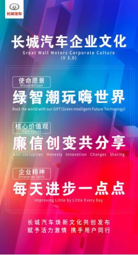 以用户为中心 企业文化全面升级 伴随着信息化产业革命,汽车生产企业和用户间的关系产生了颠覆性的变化。用户参与的已经不仅仅是销售环节,逐渐向生产、研发等全产业链延伸。 绿智潮玩 为此,长城汽车提出全新使命愿景“绿智潮玩嗨世界”,其中“绿”表示将秉承全产业链低碳环保的理念,坚持绿色、清洁能源的研发与投入,为保护绿色地球持续做贡献;“智”表示将与科技创新时代同频共振,以智能产品为核心,打造全场景高智能产业生态,为用户提供更便捷、更愉悦、更丰富的智能出行体验;“潮”表示将洞察产业浪潮、弄潮能源革命、捕捉时代潮流,提供更个性化、智能化、更有创意、有价值认同感的产品及服务;“玩”表示在智能科技的加持下让车更好玩,同时赋予产品文化内涵,汇聚具有共同爱好的用户群体玩在一起,共创专属的社交生活;“嗨世界”表示致力于全球化发展,让全球用户在“绿智潮玩”中享受惊喜和极致体验。 嗨世界 在新的核心价值观“廉信创变共分享”中,“廉”和“信”是长城汽车成立以来始终奉行的行为准则,未来,长城汽车将继续秉持公平公正、廉洁自律的作风,始终以用户为中心,诚实守信、合规经营;“创”和“变”是长城汽车向上发展的内在驱动力,长城汽车将继续坚持精准投入、追求行业领先,培厚创新土壤,不断驱动着企业以向死而生,坚如磐石的信念砥砺前行;“共分享”是长城汽车首次纳入核心价值观的内容,这种开放包容的价值观引领下,长城汽车将构建“森林模式”共生共赢生态圈,孵化更多元的业务,与员工和全产业链一同创造未来,分享成果。 廉信创变共分享 不积小流无以成江海,不积跬步无以至千里。长城汽车成立30年来秉持“每天进步一点点”的企业精神,从偏居一隅的汽车改装厂发展为中国汽车领军企业。面向未来,长城汽车要求员工要继续秉持“每天进步一点点”的精神文化,稳健务实、脚踏实地、持续创新、奋斗进取,为用户提供更具诚意、更有人性化的产品和服务。 每天进步一点点