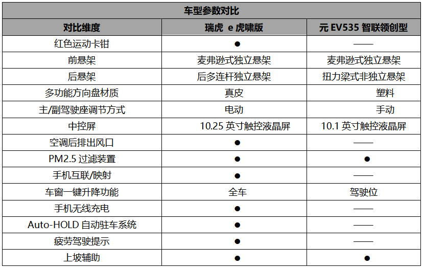 通过上面的对比可以看到,全新瑞虎e和元EV535在电池、续航方面的实力基本相当,但全新瑞虎e在动力方面的表现可以完胜元EV535。 配置功能 全新瑞虎e再领先