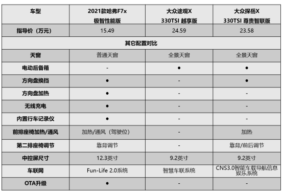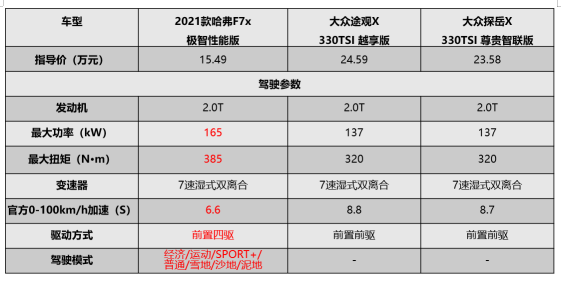 2021款哈弗F7x驾驶体验好,大众双车略有短板 乍一看,三款车都是2.0T发动机,但2021款哈弗F7x发动机参数更强,加速更迅猛,零百加速仅需6.6秒,这一脚油门到底,小心脏怕是要怦怦直跳。而两款大众车型采用2.0T低功率发动机,比2021款哈弗F7x慢了2秒不说,关键是年轻人想要的感官刺激,它 “真的做不到啊”。 这还没完,2021款哈弗F7x还拥有四驱系统,及7种驾驶模式组成的“全地形控制系统”。如此强大的底盘配置,也可以提供更出色的全路况适应能力,无论山路劈弯还是纵情越野都不在话下,周末和女朋友外出自驾嗨一天,速度与激情就是这么来的呀。而两款大众车型仅仅是前驱,也没有丰富的驾驶模式可选,只能是安安分分的城市通勤,别奢望能劈弯越野,太不现实,更愧对“轿跑SUV”这一称号。 总的来说,大众两款车型在驾驶体验上,相比于2021款哈弗F7x毫无优势可言,这一环节是2021款哈弗F7x取胜。 2021款哈弗F7x科技配置高,大众双车诚意不足 安全配置方面,2021款哈弗F7x搭载L2级自动驾驶辅助系统,拥有并线辅助、360度全景影像、自动泊车等配置,全面领先两款大众车型。 尤其值得一说的是L2级自动驾驶,绝对是谁用谁知道。每天早晚高峰,别人一脚油门一脚刹车的来回循环,而你只需要启动系统,一切交给电脑,起步价速刹车样样精通,也不用担心走神追尾,简直妙哉。而如果驾驶两款大众车型,可就没那么轻松惬意了,不具备L2级自动驾驶,自然也缺失了不少主动安全配置,不仅累腿,而且累心。 其他配置方面,2021款哈弗F7x整体表现更为优秀,率先搭载了Fun-Life 2.0系统,首搭腾讯TAI3.0功能,在智能互联方面大幅领先两款大众车型。 调查显示,有90%以上的年轻人经常用微信进行彼此联系,可以说微信交流真正实现看了跨越时间和空间的限制,能随时随地get社交和工作,有效避免错过重要信息。而在驾驶中为了安全起见,驾驶者不能及时查阅、回复微信消息,极其不便。因此,2021款哈弗F7x看到了年轻用户对“驾驶社交”的痛点,从年轻用户角度出发,搭载了车载版微信,用户可通过语音操控微信收发新消息,真正解放双手。与此同时,驾车之际如果收到微信好友发来的位置信息,还能通过语音操控在车机上发起高德地图、腾讯地图二选一的快捷导航,进一步提升驾驶的便利性和安全性。 相比之下,大众途观X和大众探岳X的“年轻思维”还远远不够,对于年轻用户的驾驶需求并未深入了解,不仅不具备车载版微信功能,抖音、全面K歌等丰富的年轻社交娱乐也通通没有。因此,两车在懂年轻用户这件事上还需向2021款哈弗F7x多多学习。 经过配置对比,大众两款车型整体依然落后2021款哈弗F7x一大截,尤其是核心的智能安全配置、智能互联配置差距明显,所以这一环节对比依然是2021款哈弗F7x取胜。 既要满足90后的买车心理,又能够给予他们真实、富有激情、同频共振的驾驶体验,综上对比不难发现,2021款哈弗F7x相比两款大众车型更适合90后的年轻用户。而反观两款大众车型,不仅价格不低,诚意不足,更缺乏“年轻思维”,因此在诸多方面表现都不及2021款哈弗F7x,“车标值10万”基本实锤。 如果你是一位务实消费者,更在意产品本身的表现,无疑2021款哈弗F7x更适合,极具诚意的价格与出色产品力表现,是轿跑SUV市场上“最值得买”的车型之一。现在购买新车,还可享受至高7000元现金优惠,更有不限品牌的15000元超强置换礼金,真诚无套路。一句“买它!”,才是对2021款哈弗F7x最好的诠释! |