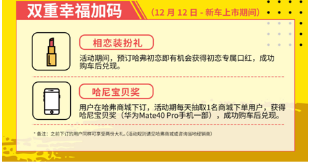 哈尼宝贝奖:用户在哈弗商城下订,活动期每天抽取1名商城下单用户,获得哈尼宝贝奖(华为Mate40 Pro手机一部),成功购车后兑现。