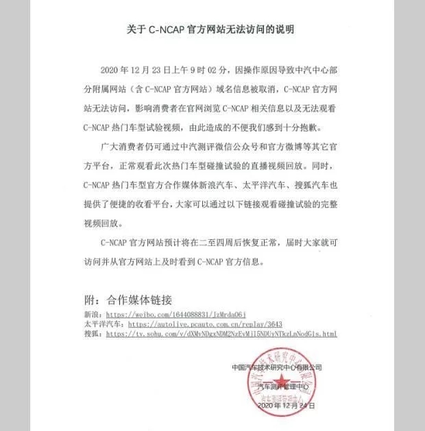 进行一个测试把自己家网站测关了的还是第一次见,随后C-NCAP官方表示:网站无法正常访问系域名信息被取消,原文如下: