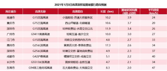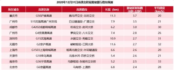出程易拥堵高速路段:G50沪渝高速重庆段 报告显示,出程方面全国高速的易缓行路段较为分散,2020年12月31日出程易拥堵缓行的高速路段前三依次为:G50沪渝高速重庆段,预计拥堵延时指数为3.7,平均车速约为20千米/小时;其次是S15沈海高速广州支线、G4202成都绕城高速。 返程易拥堵高速路段:G15沈海高速南通段 返程方面,易拥堵缓行高速路段中,广东省占6席,其中最易拥堵的高速路段前三为:G15沈海高速南通段,预计拥堵延时指数达3.9,平均车速为24千米/小时,其次是G75兰海高速重庆段,G15沈海高速深圳段。 此外,为保障乘客跨年出行,高德打车联合60余家出行合作伙伴推出元旦跨年两天全天免佣活动,并为司机师傅设置了全年最高的跑单奖励,比日常翻倍,进一步提高司机师傅出车热情,提升运力。同时,提醒大家对待疫情防控仍不要放松警惕,外出过程中要做好防护措施,佩戴好口罩,同时注意安全,切勿在人群**的地方长时间逗留。
