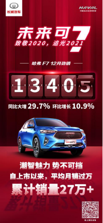 潮智再进阶领航前行。近日,哈弗品牌正式发布2020年销量成绩,其中12月哈弗SUV共计销售105,485辆,实现同比劲增34.6%的增长佳绩。年度销量方面,哈弗SUV更是实现年销750,228辆的傲人战绩续写冠军神话。纵观2020年销量数据,在哈弗品牌产品阵列中,哈弗F7表现尤为强劲。 哈弗F7仅12月销量就高达13,405辆,实现环比增长10.9%,同比猛增29.7%的双增长佳绩,延续其年轻人挚爱的潮智SUV表现。值得一提的是,哈弗F7年度销量呈现劲增趋势的同时,其产品实力、用户口碑以及营销举措等方面同样有着统治级的表现,以潮智姿态领跑市场。 爆款速成秘籍之潮智进阶 面对愈发年轻化的用户消费趋势,能在茫茫车市中过五关斩六将取得平均月销过万的优异成绩,哈弗F7过硬的产品实力绝对是根基。其高颜值潮派设计和智能科技正对当代年轻人胃口,每一处细节都能与年轻人产生强烈共鸣。 哈弗F7采用太空科技美学设计理念,完美融合年轻运动与未来科技两大元素,正中年轻人的审美点。同时,得益于全系标配Fun-Life 2.0系统和首搭腾讯TAI3.0功能,哈弗F7让开车变得便捷并充满趣味,比如开车时收到微信,双手无需离开方向盘,通过车载微信用语音指令就能完成收发信息,可谓安全又方便。拥堵路段,还可打开抖音、B站或爱奇艺刷火爆视频。简而言之,哈弗F7迎合了年轻人对车内娱乐和全网互联的需求,用车生活从此充满期待和乐趣。 另外,在年轻人酷爱的智能驾驶方面,哈弗F7同样处于同级领先位置,其配备的ADAS全新高级智能驾驶辅助可实现自动跟随前车行驶,无论高速行驶还是堵车蠕行,都能解放你双脚,让出行更加轻松惬意。而哈弗F7同步搭载智慧躲闪、车道保持等主动安全功能全程呵护行驶安全,可在你开车走神之际做出警示或避让动作,为驾驶提供更多安全防护。 另外在安全防护方面,哈弗F7以全车高强度钢比例超过65%,以及热成型钢比例高达33.4%的实力优势,在C-NCAP碰撞测试评价结果中取得了超高评价,以94.1%的综合得分率获得超五星级安全,实属同级最强。 爆款速成秘籍之服务魅力 哈弗F7之所以能实现单月销量和全年销量双赢,在强大产品力之外,有一项指标也起到了决定性作用,那就是用户口碑。在2020年中国燃油汽车行业用户满意度指数(CACSI)测评中,哈弗F7斩获了10-15万A级SUV细分市场用户满意度冠军,同时也助力哈弗品牌荣获“售后服务满意度”第一名桂冠。 其实在去年用户满意度指数评测中,哈弗F7就以先声夺人之势摘取了“市场关注新车”第一名,加之今年获得细分市场冠军头衔,由此可见年轻人对哈弗F7的认可和喜爱。 此外,为提升用户幸福指数,哈弗F7 在今年针对年轻人推出了专属的For You计划,该计划包括新人专属尊享、星级交车尊享、车主回家尊享三大服务,为用户提供至尊购车服务。在实力强大的产品中加入更多用户关怀,这正是哈弗F7实现12月同比劲增29.7%的态势,成为年轻人心中最佳潮智座驾的原因所在。 爆款速成秘籍之新晋网红 不仅是产品力深得年轻人喜爱,自上市以来,哈弗F7能够有平均月销过万、累计销量超27万的冠军级表现,与其一系列创新营销有着密不可分的联系。为引领年轻人消费风尚,哈弗F7率先进军直播带货领域,频繁出现在各大明星大咖直播间,一时间哈弗F7的话题热度和销量突飞猛进。 为覆盖更多年轻群体,哈弗F7不断跨界破圈,联合多位业界大咖上演直播带货大秀。4月,哈弗F7登陆初代网红罗永浩直播间,使其一跃成为车圈顶流网红。双十一狂欢购物节期间,哈弗F7先后联合湖南卫视主持人李维嘉和吴昕、筷子兄弟肖央开启直播带货大秀,狂撒巨额福利让利消费者,吸引千万网友在线加油打CALL,冲榜当日车圈流量第一。此外,哈弗F7还现身于《了不起的长城》、《新手驾到》等各大热门综艺中,与年轻人产生更多共同话题。 除了跨界直播、综艺外,哈弗F7还进驻时尚界,联合时尚旅游推出故事大片《所爱隔山海 山海终可平》。片尾中出现的一句话“人生不止一条路可走,将年轻进行到底,纵有起伏,终成坦途”,这种勇往直前追逐梦想的生活态度与年轻人产生了强烈共鸣,这种理念让哈弗F7瞬间收获一大波忠实粉丝。 爆款速成秘籍之发光全球 要说哪款车型是中国汽车全球化的缩影和代表,非哈弗F7莫属。在出海一周年之际,哈弗F7成为了首款驶入俄罗斯莫斯科克里姆林宫的中国品牌汽车,并成功助力哈弗品牌在俄罗斯市场销量获得中国汽车品牌第一名,其不仅是中国汽车品牌深耕欧洲市场的先锋者,更是实现中国汽车全球化的拓路者。 除涉足俄罗斯海外市场,哈弗F7还出口南美、中东、欧洲等地,以及重磅登陆美国纽约时代广场,在全球目光的最高点上展现出了哈弗品牌以及中国汽车品牌的实力。目前,其海外销售网络已经覆盖了俄罗斯、澳大利亚、南非三大主力市场的500余家全球经销商,强大的销售服务网络为哈弗F7畅销全球提供了坚实保障。 通过丰富多样的创新营销模式,哈弗F7与年轻人进行了一场高效的对话,进而实现平均月销过万的不俗战绩。同时哈弗F7还为年轻人推出了暖心的“上心”四重大礼,购车即享8500元现金优惠、不限品牌15000元超强置换补贴、至高9000元金融补贴以及娱乐+尊享服务流量3年免费的服务,拉近了与年轻人的距离。未来,随着产品力、服务和营销等各个方面的创新升级,相信哈弗F7的销量趋势还将直线上升,助力哈弗品牌引领