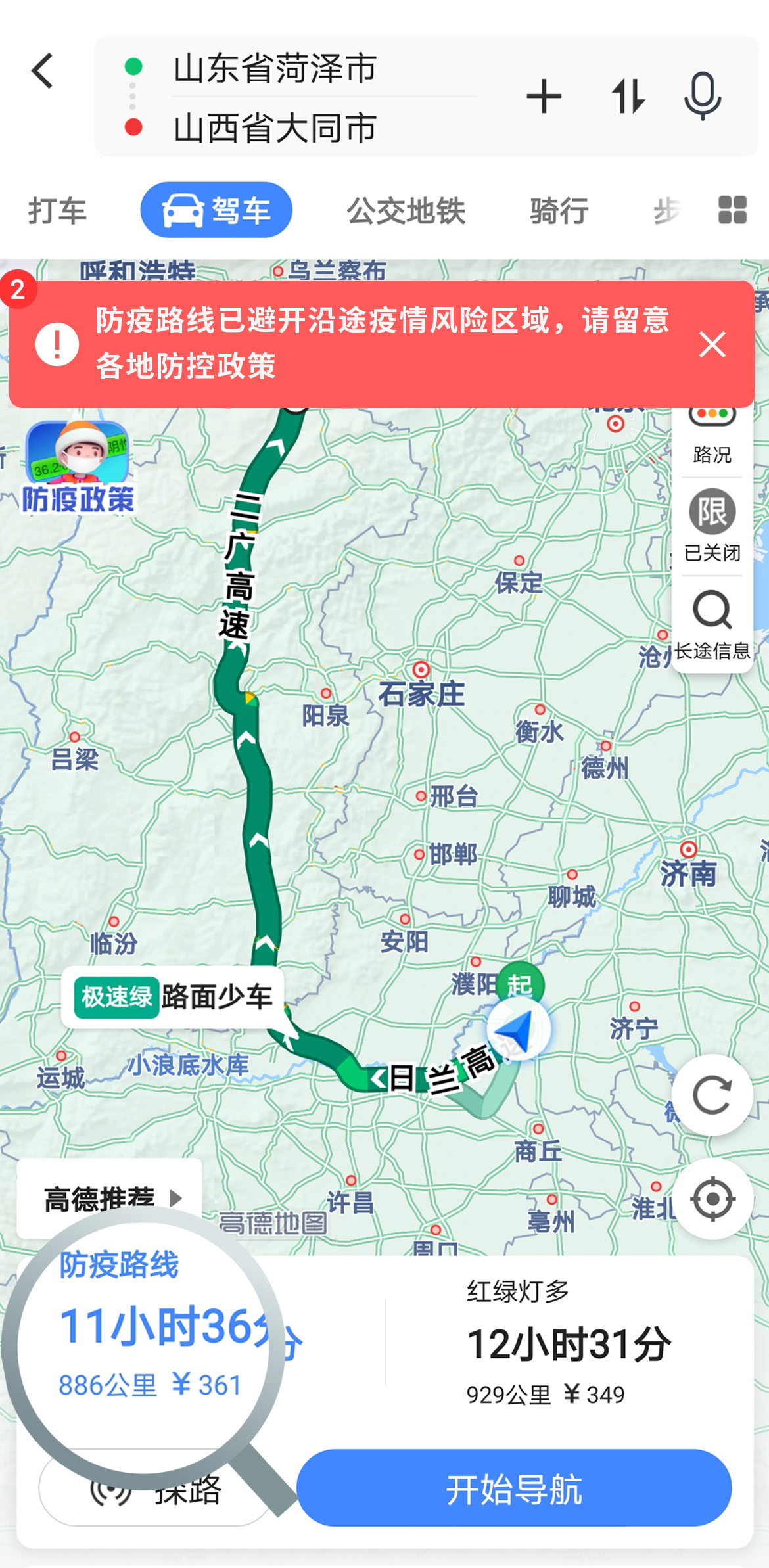 为避免用户途经中高风险地区被劝返或滞留当地的尴尬,高德地图将实时更新全国各地权威疫情防控政策和管控措施,并对路线规划完成升级。若用户行程涉及疫情风险地区,高德地图将提供疫情提醒,告知当地相关防控政策,并推荐避开疫情中、高风险地区的路线供用户选择,用户在行前路线的规划界面中可看到“防疫路线”选项。