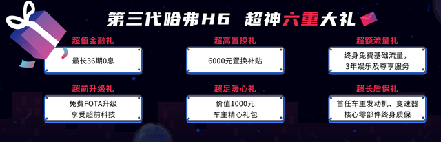 2.0T发动机通过采用高压缩比、米勒循环等先进技术,实现了高效率、低油耗、低排放的目标,热效率达到38.2%,在量产产品中处于国内领先水平。变速器方面,第二代7DCT注重效率提升,通过采用智能双泵等一系列系统,综合效率高达95.6%,达到世界一流水平。 安全方面,第三代哈弗H6 2.0T车型不止提供物理安全,更为缺少经验的新司机提供心理安全,它拥有全域主动智能安全防控系统,与碉堡级被动安全防御系统的双向保护,覆盖乘员、行人、信息等全方位行业高标准安全配备,新司机面对风云变换的路况,内心仍可安然无忧。 全面优惠 超值圆梦第三代哈弗H6 2.0T车型 在销售政策方面,哈弗通过36期0息或50%首款+ 50%尾款弹性贷的“超值金融”帮贷款用户尽早圆梦第三代哈弗H6 2.0T车型;面向置换用户,提供至高6000元的置换补贴。 在用车方面,还推出了“超额流量”政策,终身免费基础流量,3年娱乐及尊享服务,拥有了第三代哈弗H62.0T车型等于拥有了一座移动的娱乐城堡;“超前暖心”政策为购车用户提供价值1000元的车主礼包,实惠用车更进一步。在用户重点关注的售后方面,哈弗推出“首任车主发动机、变速器核心零部件终身质保”的超长质保政策,具体政策详询当地经销商。