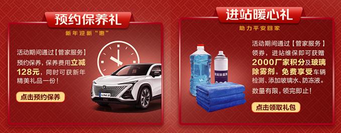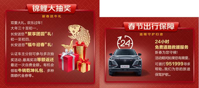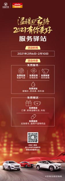 已经连续举办多年的“长安年夜FUN”也没有落下,长安汽车的关怀依然时刻相伴。尽管今年无法线下相聚,但通过互联网,与各地知名酒楼合作,1月20日起,长安汽车全国经销商为所有车主送上长安年夜FUN主题贺卡,一起云聚餐、云拜年、云抽奖,开启新一年的“长安年夜FUN”。这个春节,你依然能感受到长安汽车带给你的温暖。 新年万事新,不妨给爱车也好好地做个保养。为了更好地服务用户,也回馈用户们的信任,1月28日到2月28日,长安乘用车全国授权服务中心、特约维修站同步开启“牛运转乾坤”系列活动,为到访车主送上四重大礼:预约保养礼、进站暖心礼、锦鲤大抽奖以及新春出行保障,不仅有丰富的物质福利,更有贴心的增值服务。 如果不选择自驾,也可以选择乘坐高铁列车,这样更轻松也更方便。为了充分满足用户的需求,2月1日起一直持续到春节期间,长安汽车开行了长安专线列车,并为搭乘的长安车主准备了众多暖心小礼品。山河无恙,岁月长安。尽管路途漫漫,自有暖心相伴,长安专线列车的启程,也希望世界能够早日恢复正常。 2月6日-2月10日的出行高峰,长安汽车还将在全国的92个高速路加油站、服务区、出入口等设立服务驿站,为过往车主送上免费轮胎气压检测;免费空调系统检查;免费风挡玻璃除雾;免费添加防冻液、刹车油;免费赠送新春温暖礼包、口罩、爱心药品等。每一条回家路,有你更温暖,有你更安心。 不断的服务升级背后,是长安汽车从服务客户到经营客户的转型。从被动服务到主动服务,从服务车到服务人员,从合同纽带到情感纽带,长安汽车与用户的关系为所有的中国汽车品牌做出了表率。2020年8月,长安系中国品牌用户数已累计突破1900万,又一年春节,又一年“温暖回家路”,长安汽车正以实际行动,关怀着每一位用户。 关怀暖心,时刻温情,致敬英雄,感恩陪伴!长安汽车不断以优质智慧的产品、贴心温暖的服务,诠释着“科技长安