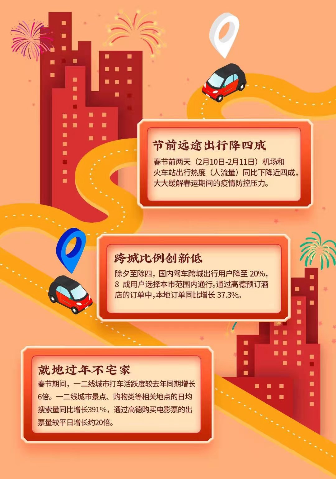 据铁路、人力资源和社会保障部等多部门统计,今年全国有超过1亿人选择就地过年。和2020年春节的全民“宅家过年”不同,得益于科学有效的疫情防控措施,“就地过年”背景下的牛年春节不仅年味儿不减,一二线城市的烟火气还更浓了。 高德地图大数据显示: 2月10日-2月11日,前往国内机场和火车站的出行热度同比下降近四成,大大缓解了春运期间的疫情防控压力。而2月12日-2月15日(正月初一至初四),出行人数虽同比增长162%,人均导航里程却同比降低三成,说明更多人选择了短途出行。 在就地过年的倡议下,2月11日到2月15日(除夕至正月初四),全国驾车跨城出行用户占比的均值较2019年、2020年同期下降明显,由2019年的29%、2020年的31%下降至20%,8成用户将活动范围控制在了本地范围内。
