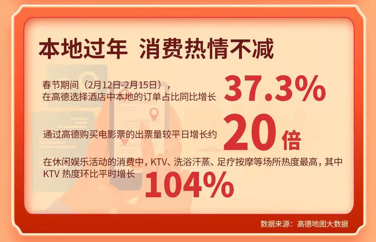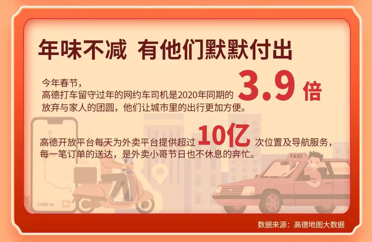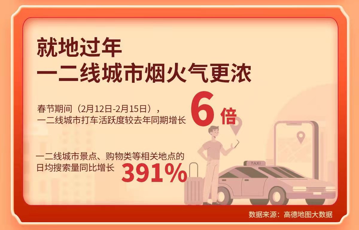 就地过年,年味不减。往年因为过年空空荡荡的一二线城市今年春节反倒有了更多别样的风景。戴好口罩,陪伴家人或朋友看一场电影,去景点或购物中心成为更多“原年人”的过年选择。有序的防控,热闹的车流,让牛年春节的一二线城市烟火气更浓。 高德打车数据显示,春节期间(2月12日-2月15日),一二线城市打车活跃度较去年同期增长6倍。而通过高德预订酒店的订单中,本地酒店订单占比同比增长37.3%,一二线城市景点、商场等相关地点的日均搜索量同比增长391%。 今年春节,高德上线线上新春庙会,超千万用户领取了本地吃喝玩乐优惠大礼包。数据显示,春节期间,通过高德导航致餐厅、小吃等场所并团购消费的订单,环比平时增加82.5%,通过高德购买电影票的出票量较平日增长约20倍。在休闲娱乐活动的消费中,洗浴汗蒸、足疗按摩、KTV等场拥有最高人气,其中KTV热度环比平时增长104%。而通过高德地图搜充电站的人数同比增长315%,新能源汽车的发展让出行更加绿色。 本地过年不减烟火气的背后,离不开千千万万服务人员的默默付出。今年春节,高德打车留守过年的网约车司机是2020年同期的3.9倍,放弃与家人的团圆,他们让城市里的出行更加方便;高德开放平台每天为外卖平台提供超过10亿次位置及导航服务,每一笔订单的送达,是外卖小哥节日也不休息的奔忙;春节期间,值守一线的各地交警们通过高德地图发布近9万次交通事件信息,哪里封路、哪里有事故,因为他们的坚守,让路上的人们可以获取更精准的实时路况。 |