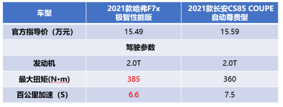 吸粉能力超强,谁才是全场撑腰王? 大厂男孩与鹅选之子,舞台上这群怀揣梦想的男孩,唱跳各有特色,想要获得更多认可,自然需要更深厚的内功。车也是如此,只有强劲的性能,才能发挥超强的实力。 2021款哈弗F7x的车主:这款车有着猛兽般的“野心”,最大峰值扭矩是385N·m,且可实现0.2秒快速换挡,当我踩下油门的瞬间,便如离弦的箭,反应那叫一个快。另外,2021款哈弗F7x创造了百公里加速低至6.6秒的惊人成绩,要知道,这样的加速成绩甚至在多数豪华品牌热销的SUV面前也很具竞争实力,让我怎能不PICK? 长安CS85 COUPE车主:先说说我的车吧,我的这款长安CS85 COUPE,爆发力也很强劲, 360N·m的最大峰值扭矩,与2021款哈弗F7x相差不多,可以说爆发力也很强劲。但在速度上,我无法给它“洗白”, 7.5s的百公里加速成绩,在6.6s面前,应该是拿不到A等级了。
